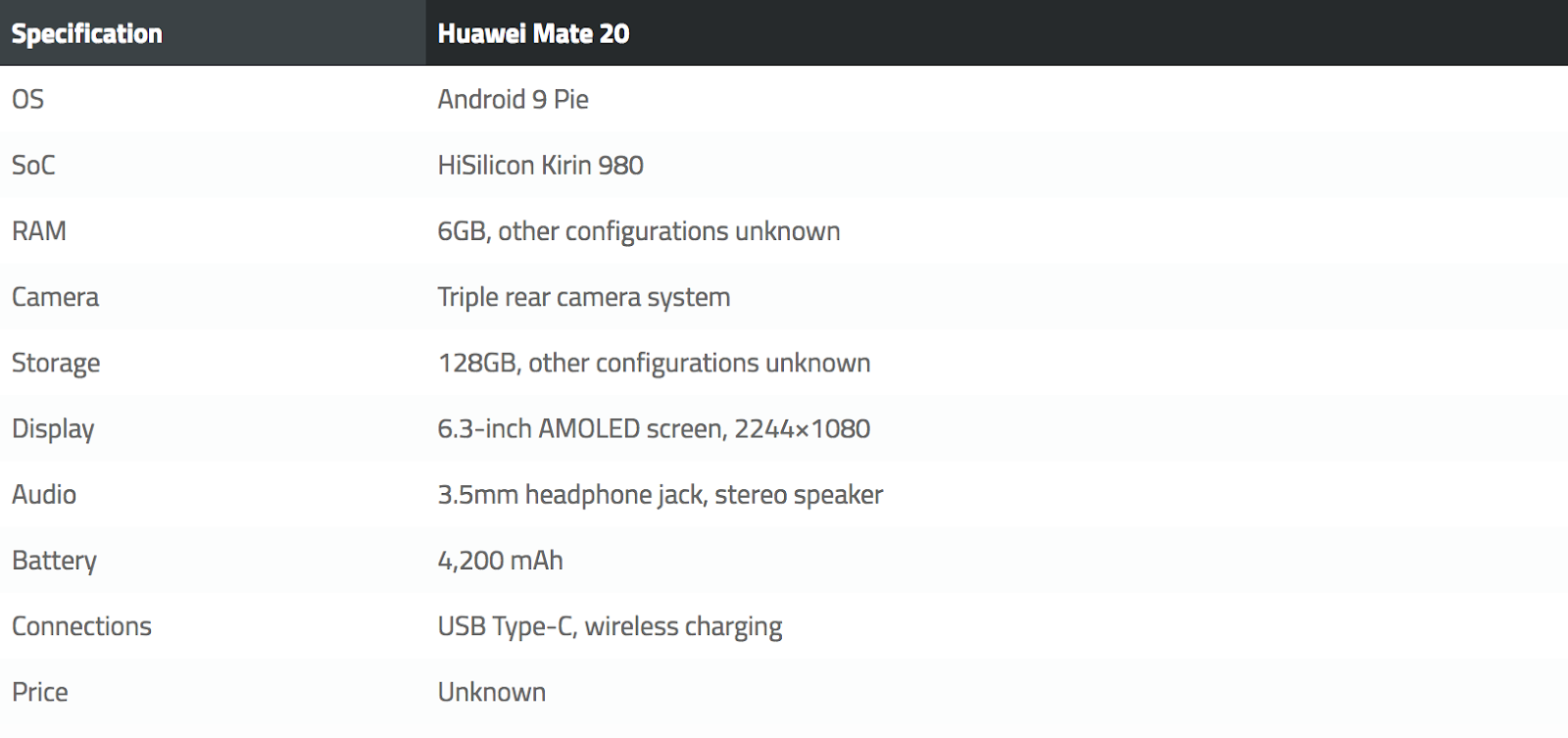 ដោយសារតែ Mate 20 ប្រើផ្ទៃកញ្ចក់នៅខាងក្រោយ ដូច្នេះវានឹងក្លាយជាស្មាតហ្វូនរបស់ Huawei ដំបូងគេ ដែលប្រើប្រាស់បច្ចេកវិទ្យាសាកថ្មឥតខ្សែ (Wireless Charge) ចំណែកកម្លាំងម៉ាស៊ីនវិញ Mate 20 មានអេក្រង់ 6.3-inch (2244 x 1080 pixel) ប្រើកញ្ចក់ AMOLED បំពាក់បន្ទះឈីប Kirin 980 មាន RAM ទំហំ 6GB និងទំហំថ្ម 4,200mAh៕
