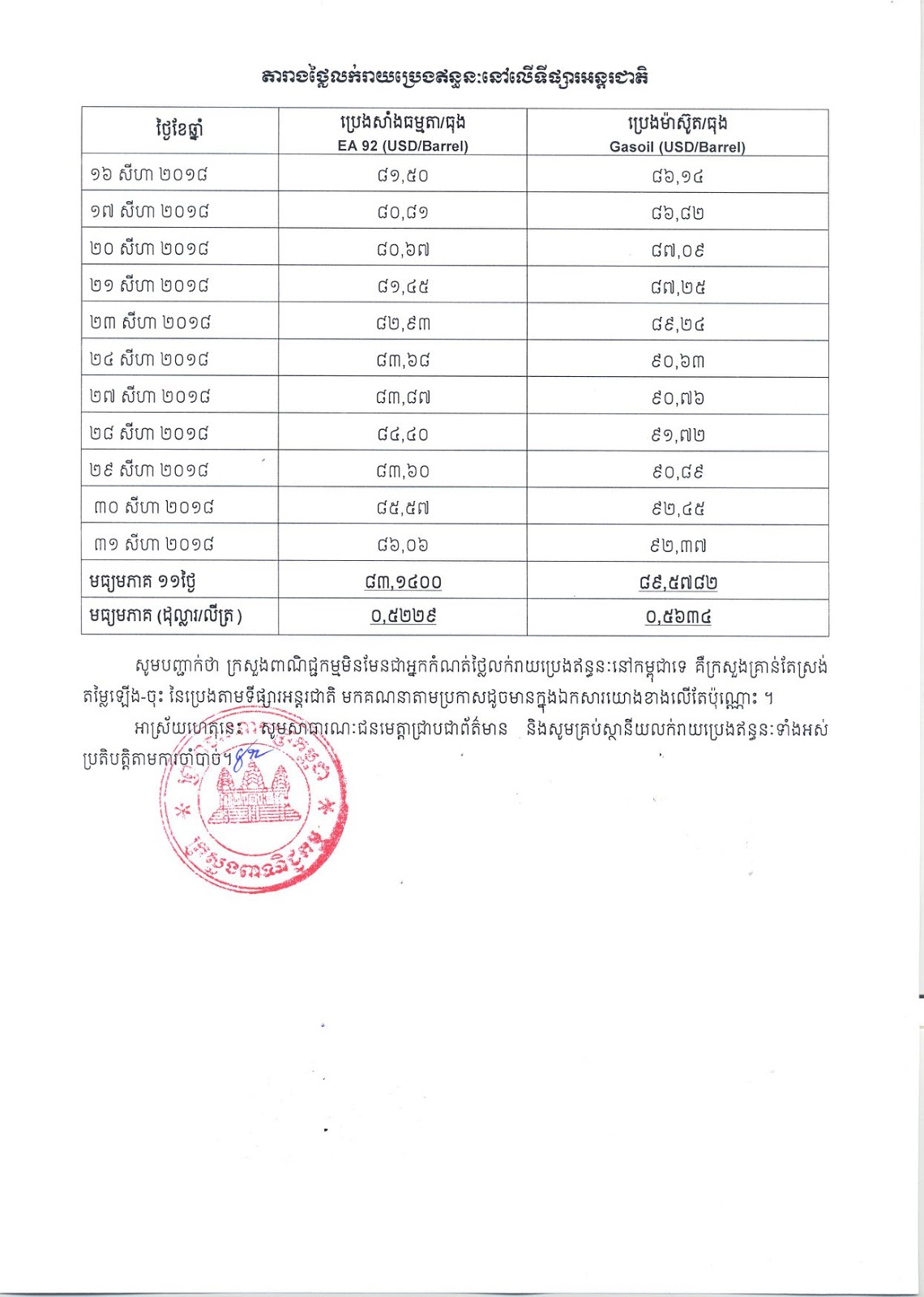រាជធានីភ្នំពេញ៖ នារសៀលថ្ងៃទី០៣ ខែកញ្ញា ឆ្នាំ២០១៨ នេះ ក្រសួងពាណិជ្ជកម្ម បានចេញសេចក្តីជូនដំណឹងស្តីអំពីតម្លៃលក់រាយប្រេងឥន្ធនៈនៅតាមស្ថានីយទាំងអស់ក្នុងព្រះរាជាណាចក្រកម្ពុជាសម្រាប់អនុវត្តចាប់ពីថ្ងៃទី០១ ដល់ថ្ងៃទី១៥ ខែកញ្ញា ឆ្នាំ២០១៨ ដែលប្រេងសាំងធម្មតាក្នុងមួយលីត្រមានតម្លៃ ៤,០៥០រៀល និងប្រេងម៉ាស៊ូតក្នុងមួយលីត្រមានតម្លៃ ៣,៩០០រៀល ហើយតម្លៃនេះមានការឡើងថ្លៃបន្តិចបើធៀបនឹងតម្លៃ ដែលក្រសួងបានកំណត់កាលពី១៥ថ្ងៃមុន ដែលប្រេងសាំងធម្មតាក្នុងមួយលីត្រតម្លៃ៤,០០០រៀល និងប្រេងម៉ាស៊ូតក្នុងមួយលីត្រម្លៃ ៣,៨០០រៀល៕