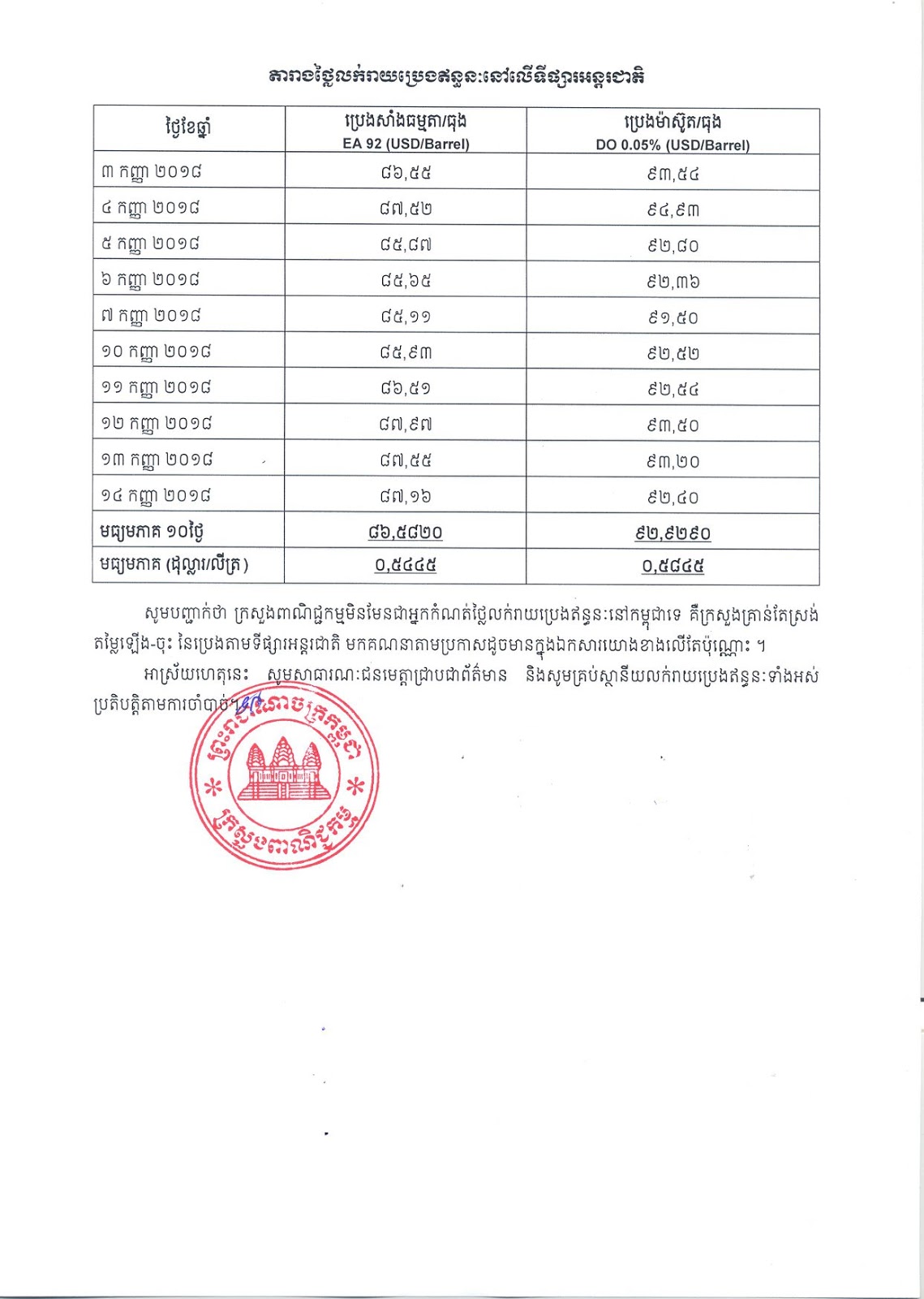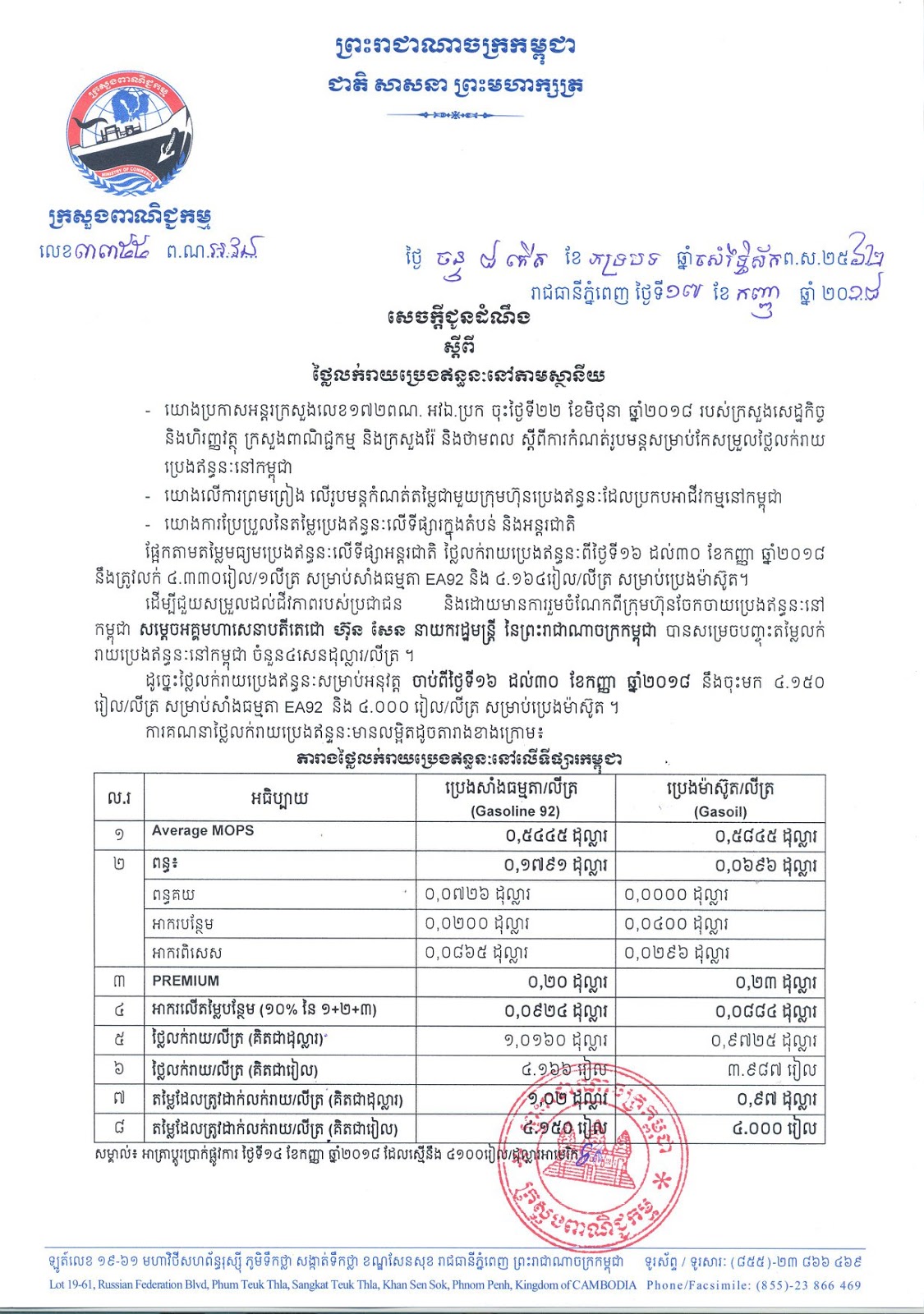 រាជធានីភ្នំពេញ៖ នាព្រឹកថ្ងៃទី១៧ ខែកញ្ញា ឆ្នាំ២០១៨ នេះ ក្រសួងពាណិជ្ជកម្ម បានចេញសេចក្តីជូនដំណឹងស្តីអំពីតម្លៃលក់រាយប្រេងឥន្ធនៈនៅតាមស្ថានីយទាំងអស់ក្នុងព្រះរាជាណាចក្រកម្ពុជាសម្រាប់អនុវត្តចាប់ពីថ្ងៃទី១៦ ដល់ថ្ងៃទី៣០ ខែកញ្ញា ឆ្នាំ២០១៨ ដែលប្រេងសាំងធម្មតាក្នុងមួយលីត្រមានតម្លៃ ៤,១៥០រៀល និងប្រេងម៉ាស៊ូតក្នុងមួយលីត្រមានតម្លៃ ៤,០០០រៀល ហើយតម្លៃនេះមានការឡើងថ្លៃបើធៀបនឹងតម្លៃ ដែលក្រសួងបានកំណត់កាលពី១៥ថ្ងៃមុន ដែលប្រេងសាំងធម្មតាក្នុងមួយលីត្រតម្លៃ៤,០៥០រៀល និងប្រេងម៉ាស៊ូតក្នុងមួយលីត្រម្លៃ ៣,៩០០រៀល៕