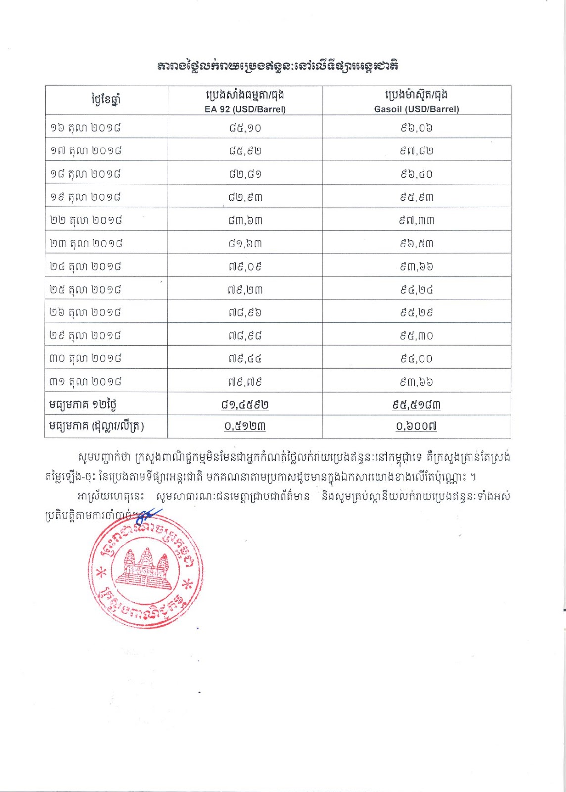 រាជធានីភ្នំពេញ៖ យោងតាមលិខិតរបស់ក្រសួងពាណិជ្ជកម្ម ចុះផ្សាយថ្ងៃទី០១ ខែវិច្ឆិកា ឆ្នាំ២០១៨ ស្តីអំពីតម្លៃលក់រាយប្រេងឥន្ធនៈនៅតាមស្ថានីយទាំងអស់ក្នុងព្រះរាជាណាចក្រកម្ពុជាសម្រាប់អនុវត្តចាប់ពីថ្ងៃទី០១ ដល់ថ្ងៃទី១៥ ខែវិច្ឆិកា ឆ្នាំ២០១៨ បានឲ្យដឹងថា ប្រេងសាំងធម្មតាក្នុងមួយលីត្រមានតម្លៃ ៤,០០០រៀល ចំណែកឯប្រេងម៉ាស៊ូតវិញមានតម្លៃស្មើរសាំងធម្មតាដែរ គឺ៤,០០០រៀលក្នុងមួយលីត្រដែរ ហើយតម្លៃនេះមានការធ្លាក់ចុះបើធៀបនឹងតម្លៃ ដែលក្រសួងបានកំណត់កាលពី១៥ថ្ងៃមុន ដែលប្រេងសាំងធម្មតាក្នុងមួយលីត្រតម្លៃ៤,២៥០រៀល និងប្រេងម៉ាស៊ូតក្នុងមួយលីត្រម្លៃ ៤,១៥០រៀល៕