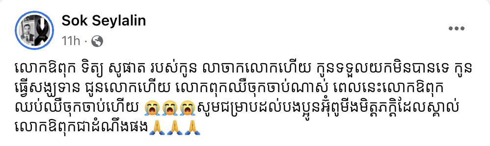 យោងតាមការបង្ហោះនៅលើគណនីហ្វេសប៊ុករបស់ កញ្ញា សុខ សីឡាលីន បានឲ្យដឹងថា “លោកឱពុក ទិត្យ សូផាត របស់កូន លាចាកលោកហើយ កូនទទួលយកមិនបានទេ កូនធ្វើសង្ឃទាន ជូនលោកហើយ លោកពុកឈឺចុកចាប់ណាស់ ពេលនេះលោកឱពុក ឈប់ឈឺចុកចាប់ហើយ 😭😭😭សូមជម្រាបដល់បងប្អូនអ៊ុំពូមីងមិត្តភក្តិដែលស្គាល់លោកឱពុកជាដំណឹងផង🙏🙏🙏”៕