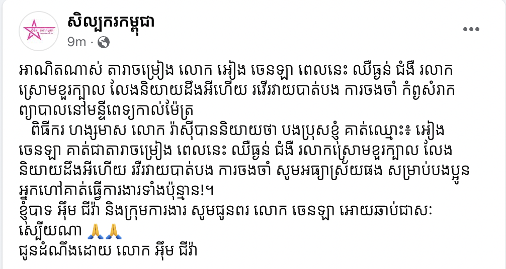 យោងតាមការបញ្ជាក់ពី សិល្បករកម្ពុជា បានឲ្យដឹងថា “អាណិតណាស់ តារាចម្រៀង លោក អៀង ចេនឡា ពេលនេះ ឈឺធ្ងន់ ជំងឺ រលាកស្រោមខួរក្បាល លែងនិយាយដឹងអីហើយ រវើរវាយបាត់បង់ការចងចាំ កំពុងសំរាកព្យាបាលនៅមន្ទីពេទ្យកាល់ម៉ែត្រ។ ពិធីករ ហង្សមាស លោក រ៉ាសុីបាននិយាយថា បងប្រុសខ្ញុំ គាត់ឈ្មោះ៖ អៀង ចេនឡា គាត់ជាតារាចម្រៀង ពេលនេះ ឈឺធ្ងន់ ជំងឺ រលាកស្រោមខួរក្បាល លែងនិយាយដឹងអីហើយ រវើរវាយបាត់បង់ការចងចាំ សូមអធ្យាស្រ័យផង សម្រាប់បងប្អូនអ្នកហៅគាត់ធ្វើការងារទាំងប៉ុន្មាន!។ ខ្ញុំបាទ អុឹម ជីវ៉ា និងក្រុមការងារ សូមជូនពរ លោក ចេនឡា អោយឆាប់ជាសះស្បើយណា 🙏🙏 ជូនដំណឹងដោយ លោក អុឹម ជីវ៉ា“៕