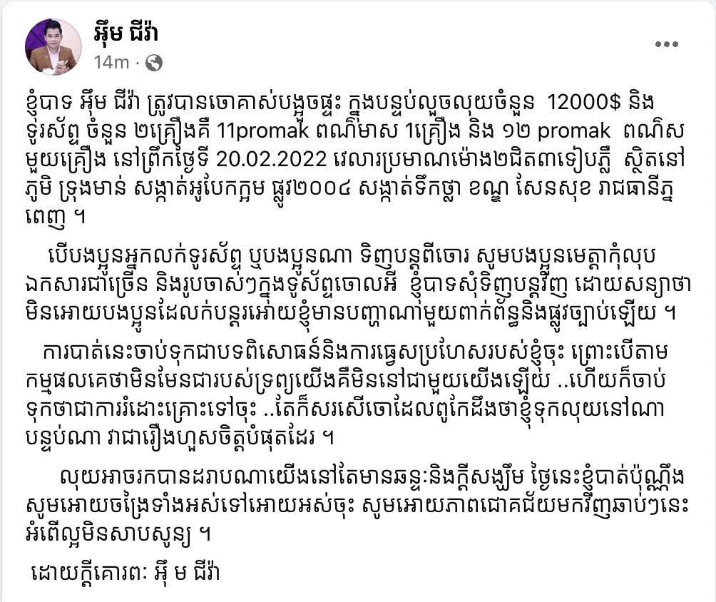 “ខ្ញុំបាទ អុឹម ជីវ៉ា ត្រូវបានចោគាស់បង្អួចផ្ទះ ក្នុងបន្ទប់លួចលុយចំនួន 12000$ និងទូរស័ព្ទ ចំនួន ២គ្រឿងគឺ 11 pro max ពណ៌មាស 1គ្រឿង និង ១២ pro max ពណ៌ស មួយគ្រឿង នៅព្រឹកថ្ងៃទី 20.02.2022 វេលាប្រមាណម៉ោង២ជិត៣ទៀបភ្លឺ ស្ថិតនៅភូមិ ទ្រុងមាន់ សង្កាត់អូបែកក្អម ផ្លូវ២០០៤ សង្កាត់ទឹកថ្លា ខណ្ឌ សែនសុខ រាជធានីភ្នពេញ ។ បើបងប្អូនអ្នកលក់ទូរស័ព្ទ ឬបងប្អូនណា ទិញបន្តពីចោរ សូមបងប្អូនមេត្តាកុំលុបឯកសារជាច្រើន និងរូបចាស់ៗក្នុងទូស័ព្ទចោលអី ខ្ញុំបាទសុំទិញបន្តវិញ ដោយសន្យាថាមិនអោយបងប្អូនដែលក់បន្តអោយខ្ញុំមានបញ្ហាណាមួយពាក់ព័ន្ធនិងផ្លូវច្បាប់ឡើយ ។ ការបាត់នេះចាត់ទុកជាបទពិសោធន៍និងការធ្វេសប្រហែសរបស់ខ្ញុំចុះ ព្រោះបើតាមកម្មផលគេថាមិនមែនជារបស់ទ្រព្យយើងគឺមិននៅជាមួយយើងឡើយ ..ហើយក៏ចាត់ទុកថាជាការរំដោះគ្រោះទៅចុះ ..តែក៏សរសើចោរដែលពូកែដឹងថាខ្ញុំទុកលុយនៅណា បន្ទប់ណា វាជារឿងហួសចិត្តបំផុតដែរ។ លុយអាចរកបានដរាបណាយើងនៅតែមានឆន្ទៈនិងក្តីសង្ឃឹម ថ្ងៃនេះខ្ញុំបាត់ប៉ុណ្ណឹង សូមអោយចង្រៃទាំងអស់ទៅអោយអស់ចុះ សូមអោយភាពជោគជ័យមកវិញឆាប់ៗនេះ អំពើល្អមិនសាបសូន្យ ។