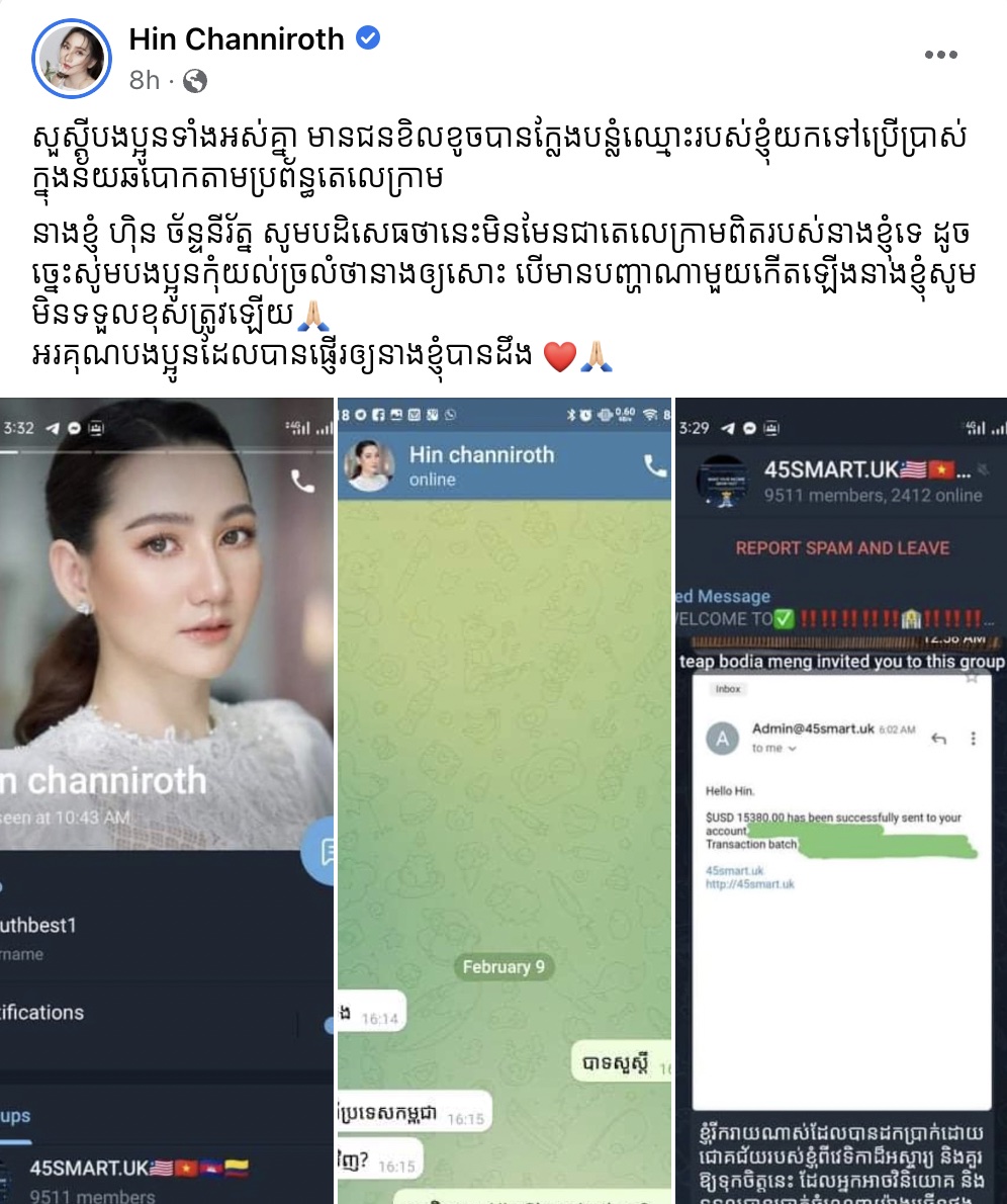 “សួស្តីបងប្អូនទាំងអស់គ្នា មានជនខិលខូចបានក្លែងបន្លំឈ្មោះរបស់ខ្ញុំយកទៅប្រើប្រាស់ក្នុងន័យឆបោកតាមប្រព័ន្ធតេលេក្រាម នាងខ្ញុំ ហុិន ច័ន្ទនីរ័ត្ន សូមបដិសេធថានេះមិនមែនជាតេលេក្រាមពិតរបស់នាងខ្ញុំទេ ដូចច្នេះសូមបងប្អូនកុំយល់ច្រលំថានាងខ្ញុំឲ្យសោះ បើមានបញ្ហាណាមួយកើតឡើងនាងខ្ញុំសូមមិនទទួលខុសត្រូវឡើយ🙏🏻 អរគុណបងប្អូនដែលបានផ្ញើឲ្យនាងខ្ញុំបានដឹង ❤️🙏🏻”៕