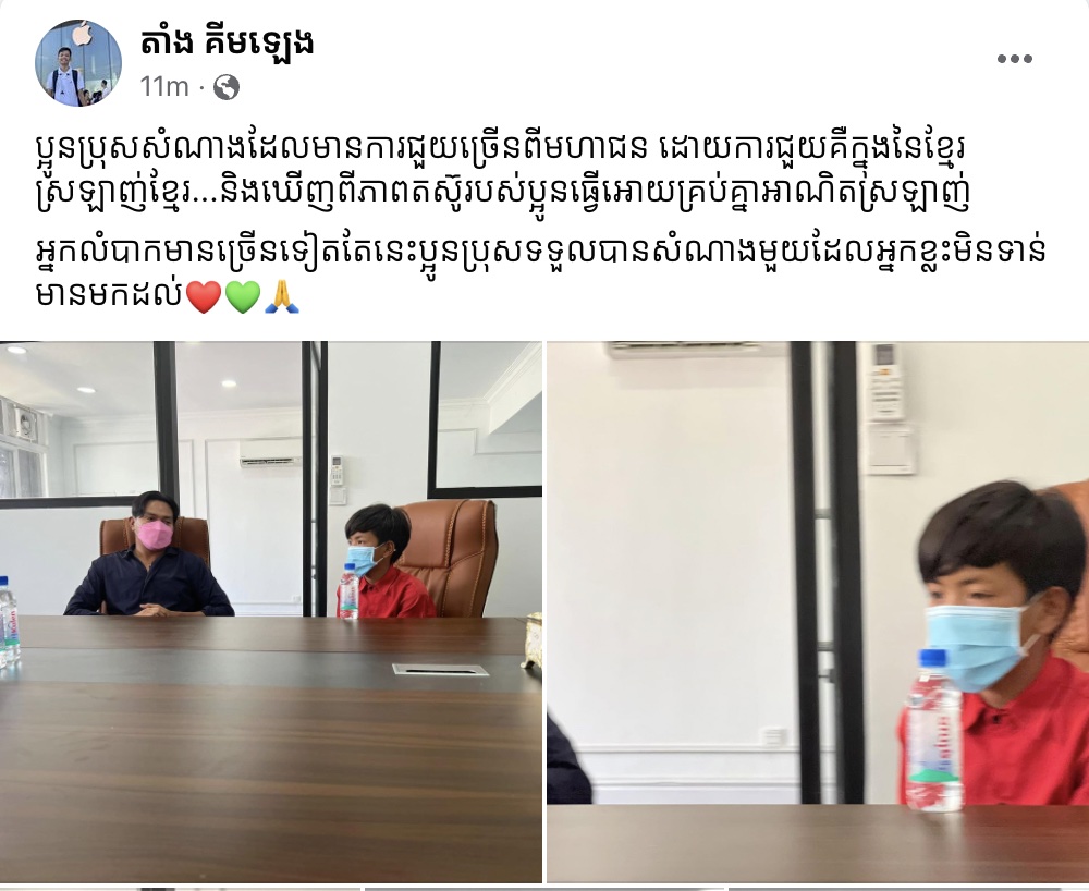 យោងតាមការបង្ហោះពីលោក តាំង គីមឡេង មុននេះបន្តិចបានឲ្យដឹងថា ឥលូវនេះប្អូនប្រុសលក់លៀសហាលបានមកជួយលោកឧកញ៉ា ខេមរៈ សិរីមន្ត ហើយ។ លោក តាំង គីមឡេង បានរៀបរាប់ថា “ប្អូនប្រុសសំណាងដែលមានការជួយច្រេីនពីមហាជន ដោយការជួយគឺក្នុងន័យខ្មែរស្រឡាញ់ខ្មែរ…និងឃេីញពីភាពតស៊ូរបស់ប្អូនធ្វេីអោយគ្រប់គ្នាអាណិតស្រឡាញ់ អ្នកលំបាកមានច្រេីនទៀតតែនេះប្អូនប្រុសទទួលបានសំណាងមួយដែលអ្នកខ្លះមិនទាន់មានមកដល់❤️️💚🙏”៕