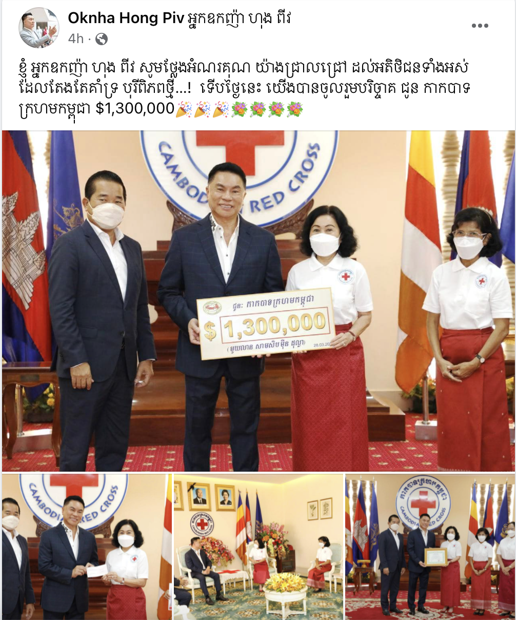 អ្នកឧកញ៉ា ហុង ពីវ បរិច្ចាគថវិកា 1.3លានដុល្លារជូនដល់ កាកបាទក្រហមកម្ពុជា