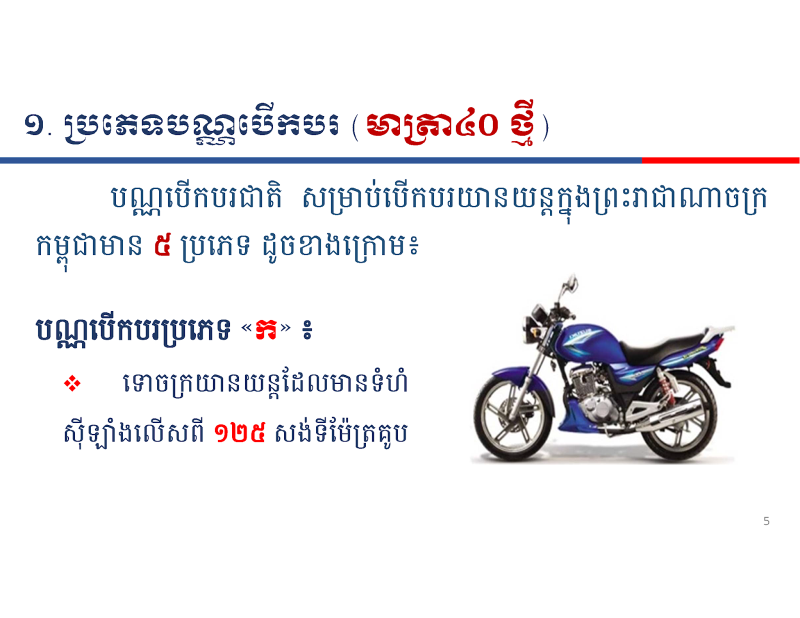 ប័ណ្ណបើកបរ សម្រាប់បើកបរយានយន្តនៅក្នុងព្រះរាជាណាចក្រកម្ពុជាយើងមានចំនួន៥ ប្រភេទគឺ ប្រភេទ “ក” “ខ” “គ” “ឃ” និង “ង”។ សម្រាប់ប័ណ្ណបើកបរជាតិ ប្រភេទ ” ក ” បានផ្តល់នូវអត្ថប្រយោជន៍ និងសារៈសំខាន់ចាំបាច់ ចំពោះអ្នកបើកបរ ទោចក្រយានយន្ត និង ត្រីចក្រយានយន្ត ទាំងអស់ ដែលធ្វើចរាចរណ៍លើផ្លូវសាធារណៈ ក្នុងព្រះរាជាណាចក្រកម្ពុជា ហើយប័ណ្ណបើកបរប្រភេទ “ក” អាចបើកបរយានយន្តបានដូចខាងក្រោម៖