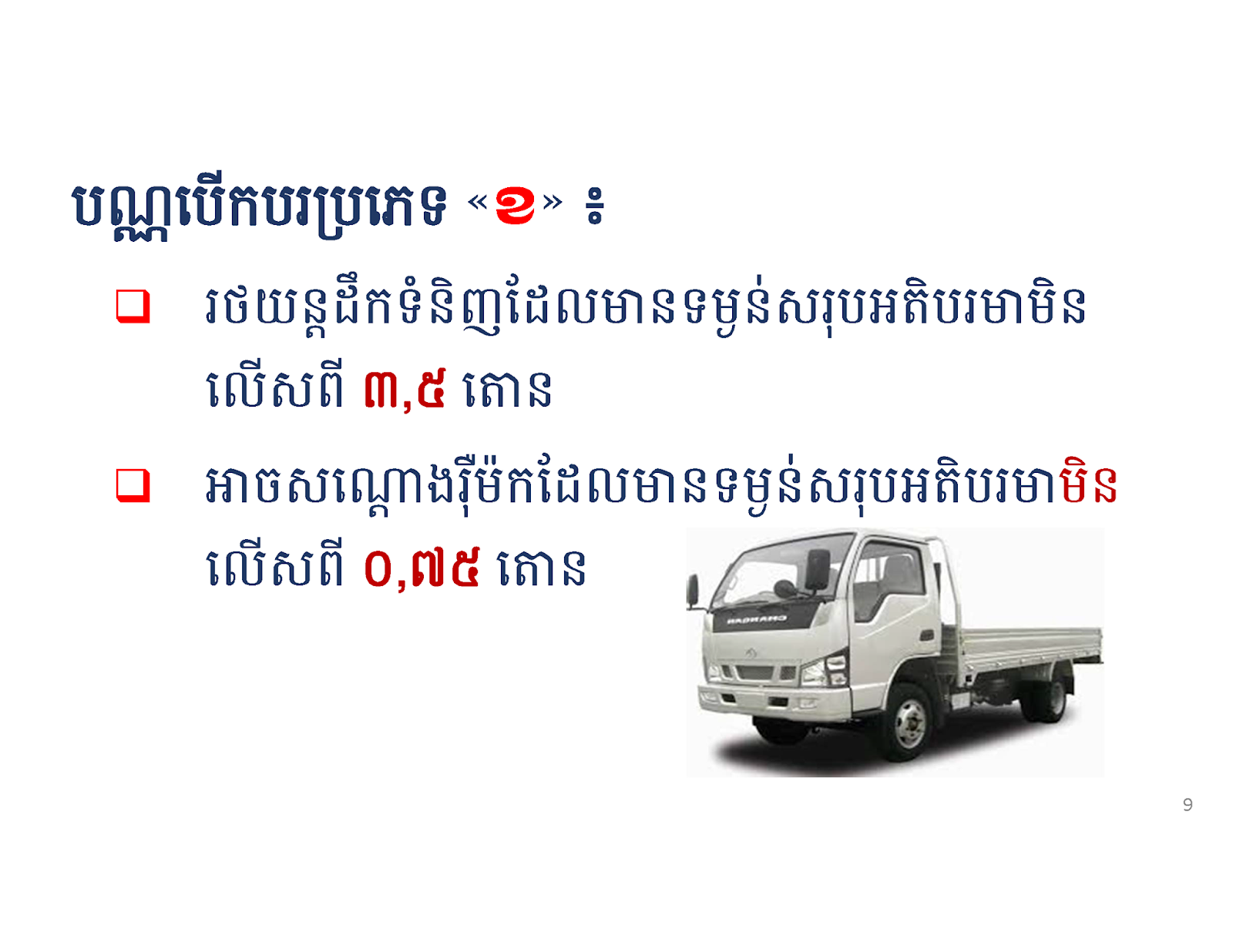 – រថយន្តដឹកទំនិញ ដែលមានទម្ងន់សរុបអតិបរមាមិនលើសពី ៣,៥តោន