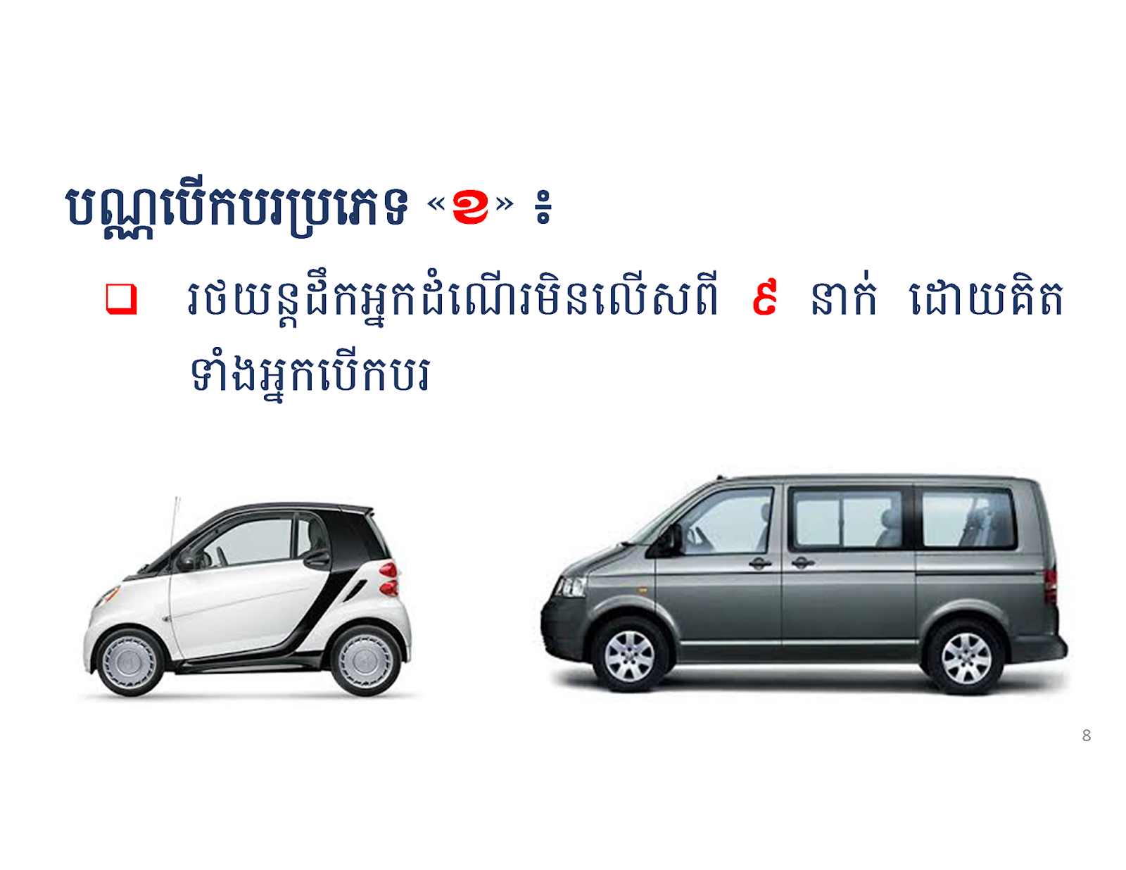 – រថយន្តដឹកអ្នកដំណើរមិនលើសពី០៩នាក់ ដោយគិតទាំងអ្នកបើករ