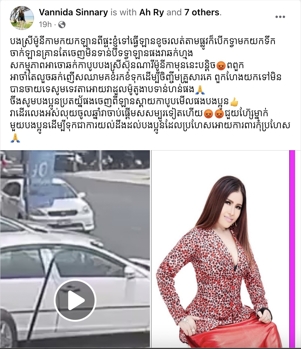 យោងតាមការបញ្ជាក់នៅលើគណនីហ្វេសប៊ុក Vannida Sinnary កាលពីថ្ងៃទី២០ ខែមេសា ឆ្នាំ២០២២ បានឲ្យដឹងថា “បងស្រីម៉ូនីកាមកយកឡានពីផ្ទះខ្ញុំទៅធ្វើឡានខូចរលត់តាមផ្លូវក៏បើកទ្វារមកយកទឹកចាក់ឡានគ្រាន់តែចេញមិនទាន់បិទទ្វារឡានផងវាឆក់ហ្មង