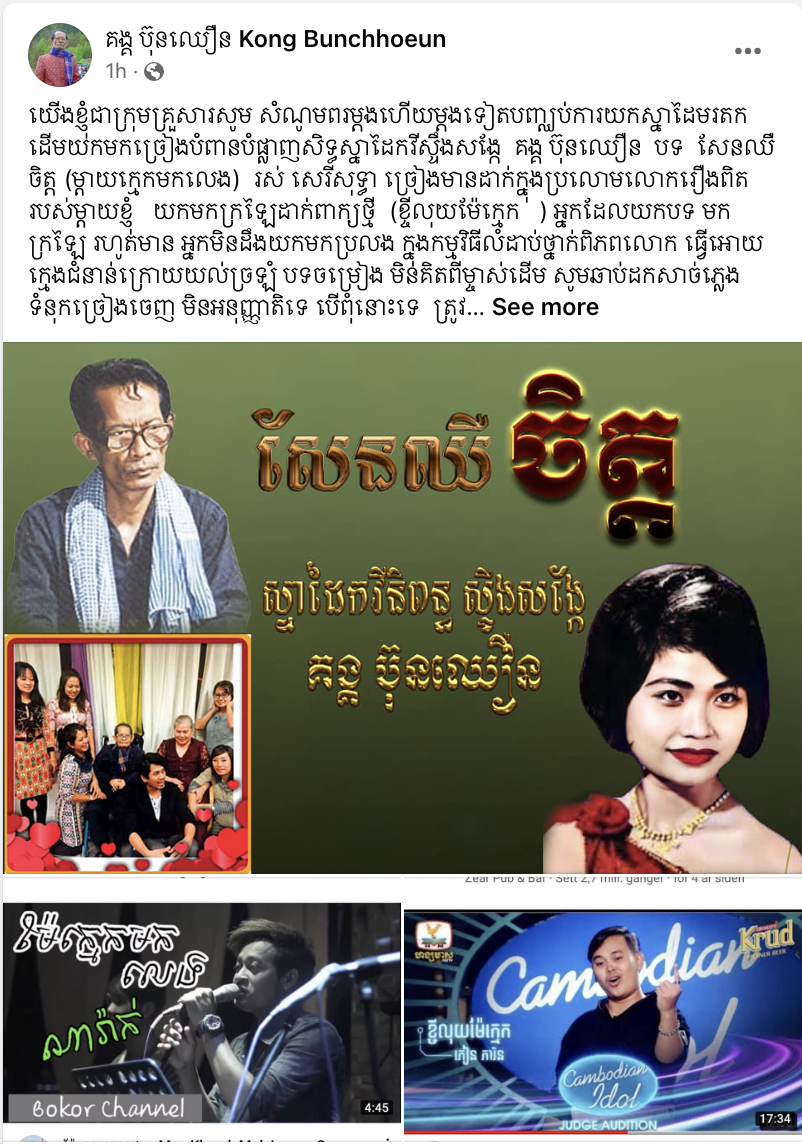 ថ្មីៗនេះកូនស្រី កវីស្ទឹងសង្កែ គង្គ ប៊ុនឈឿន បានចេញមុខប្រតិកម្មថា ៖ “យើងខ្ញុំជាក្រុមគ្រួសារសូម សំណូមពរម្ដងហើយម្ដងទៀតបញ្ឈប់ការយកស្នាដៃមរតកដើមយកមកច្រៀងបំពានបំផ្លាញសិទ្ធស្នាដៃកវីស្ទឹងសង្កែ គង្គ ប៊ុនឈឿន បទ សែនឈឺចិត្ត (ម្តាយក្មេកមកលេង) រស់ សេរីសុទ្ធា ច្រៀងមានដាក់ក្នុងប្រលោមលោករឿងពិតរបស់ម្ដាយខ្ញុំ យកមកក្រឡៃដាក់ពាក្យថ្មី (ខ្ចីលុយម៉ែក្មេក) អ្នកដែលយកបទ មកក្រឡៃ រហូតមាន អ្នកមិនដឹងយកមកប្រលង ក្នុងកម្មវិធីលំដាប់ថ្នាក់ពិភពលោក ធ្វើអោយក្មេងជំនាន់ក្រោយយល់ច្រឡំ បទចម្រៀង មិនគិតពីម្ចាស់ដើម សូមឆាប់ដកសាច់ភ្លេង ទំនុកច្រៀងចេញ មិនអនុញ្ញាតិទេ បើពុំនោះទេ ត្រូវប្រឈមនឹងច្បាប់កម្មសិទ្ធបញ្ញា។ សូមបញ្ជាក់ថាពួកខ្ញុំគាំទ្រស្នាដៃកូនខ្មែរបង្កើតថ្មី តែមិនក្រឡៃបទ ម្ចាស់ដើម. កន្លងមក ដូច រឿងនាយចឺម យក បទ នឹកភូមិភ្នំធំ មកក្រឡៃ ធ្វើអោយក្រុមគ្រួសារខ្ញុំចេញមុខ តវ៉ា .កាលនោះមានមនុស្សជាច្រើនគិតថា ម្តាយខ្ញុំបានប្ដឹងបាន លុយ បានអី ហើយដើរ រករឿងគេ គ្រាន់តែយកបទចម្រៀងមក ច្រៀងថ្មី សោះ .តាម ការពិតក្រុមគ្រួសារខ្ញុំមិនដែលប្ដឹងអ្នកណា រី បានសំណងពី នរណាម្នាក់ទេ .តើខុសទេដែលម្ចាស់ដើមទាមទារថែរក្សាកម្មសិទ្ធិ បទចម្រៀងរបស់ខ្លួន? សូមមានសុខភាពល្អ ដល់ បងប្អូនគ្រប់ៗគ្នាដែលគាំទ្រចម្រៀងមរតកដើម អរគុណ ដោយក្តីគោរពពីនាងខ្ញុំ ប៊ុនឈឿន សូរីវិល័យ ជាកូនស្រី (អ្នកកាន់ផេករបស់លោកប៉ា គង្គ ប៊ុនឈឿន)”