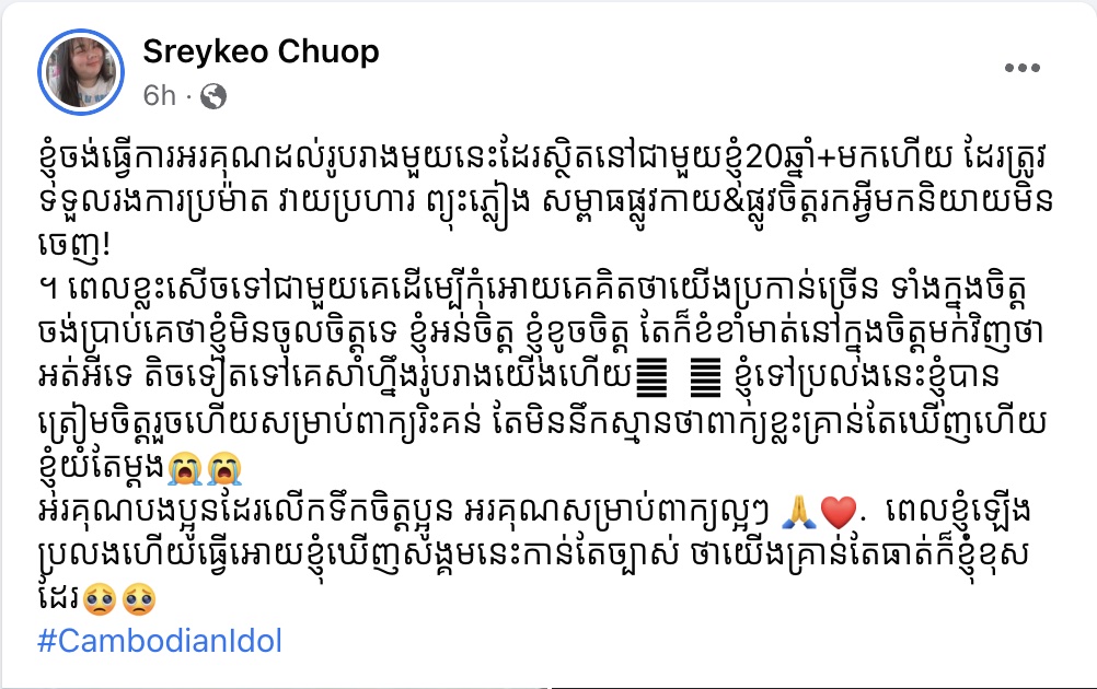 បេក្ខនារី ជួប ស្រីកែវ ដែលប្រឡង Cambodian Idol បង្ហោះសារអន់ចិត្តយ៉ាងខ្លាំង ដែលត្រូវអ្នកលេងហ្វេសប៊ុកមួយចំនួនប្រមាថ មើលងាយ លេងសើច រូបរាងរបស់គាត់