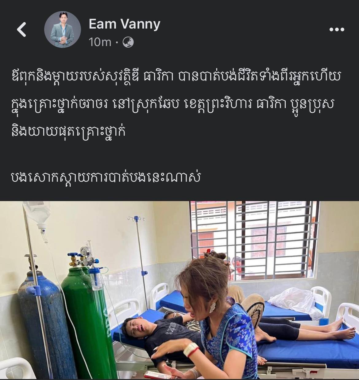 តារាចម្រៀងវ័យក្មេង សុវត្ថិឌី ធារិកា បានជួបគ្រោះថ្នាក់ចរាចរណ៍មួយធ្វើអោយរថយន្តរបស់នាងក្រឡាប់ធ្លាក់ចូលប្រឡាយ បណ្តាលអោយឪពុកនិងម្តាយរបស់នាងបានបាត់បង់ជីវិត ខណៈដែលប្អូនប្រុស ជីដូន និងរូបនាងផ្ទាល់រួចផុតពីគ្រោះថ្នាក់នេះបើតាមការបង្ហោះអោយដឹងពីសំណាក់លោក អ៊ាម វន្នី។