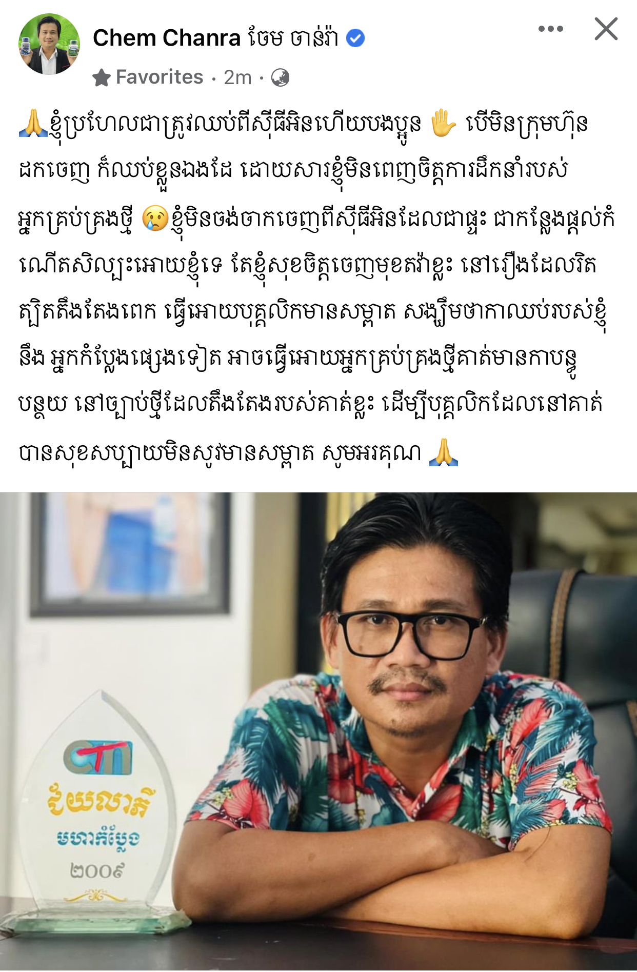 លោក ពែកមី ប្រកាសដើរចេញពី CTN ព្រោះមិនពេញចិត្តការដឹកនាំរបស់អ្នកគ្រប់គ្រងថ្មី