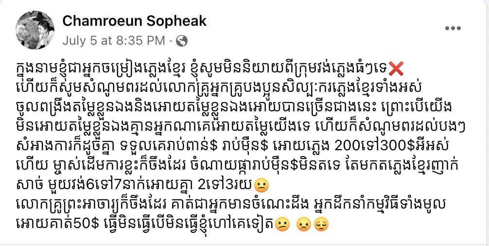 កញ្ញា ចំរើន សុភ័ក្ត្រ បានរៀបរាប់ឲ្យដឹងថា៖ «ក្នុងនាមខ្ញុំជាអ្នកចម្រៀងភ្លេងខ្មែរ ខ្ញុំសូមមិននិយាយពីក្រុមវង់ភ្លេងធំៗទេ❌ ហើយក៏សូមសំណូមពរដល់លោកគ្រូអ្នកគ្រូបងប្អូនសិល្បៈករភ្លេងខ្មែរទាំងអស់ ចូលពង្រឹងតម្លៃខ្លួនឯងនិងអោយតម្លៃខ្លួនឯងអោយបានច្រេីនជាងនេះ ព្រោះបើយើងមិនអោយតម្លៃខ្លួនឯងគ្មានអ្នកណាគេអោយតម្លៃយើងទេ ហើយក៏សំណូមពរដល់បងៗសំអាងការក៏ដូចគ្នា ទទួលគេរាប់ពាន់$ រាប់ម៉ឺន$ អោយភ្លេង 200ទៅ300$អីអស់ហើយ ម្ចាស់ដេីមការខ្លះក៏ចឹងដែរ ចំណាយផ្ការាប់ម៉ឺន$មិនតទេ តែមកតភ្លេងខ្មែរញាក់សាច់ មួយវង់6ទៅ7នាក់អោយគ្នា 2ទៅ3រយ😐 លោកគ្រូព្រះអាចារ្យក៏ចឹងដែរ គាត់ជាអ្នកមានចំណេះដឹង អ្នកដឹកនាំកម្មវិធីទាំងមូល អោយគាត់50$ ធ្វើមិនធ្វើបើមិនធ្វើខ្ញុំហៅគេទៀត😕 ☹️😔»៕