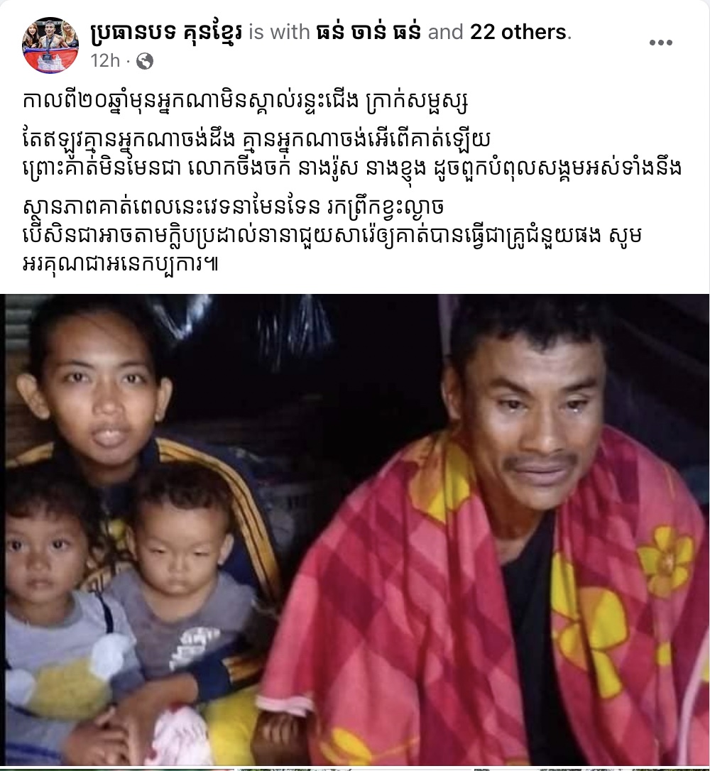 «កាលពី២០ឆ្នាំមុនអ្នកណាមិនស្គាល់រន្ទះជើង ក្រាក់ សម្ផស្ស តែឥឡូវគ្មានអ្នកណាចង់ដឹង គ្មានអ្នកណាចង់អើពើគាត់ឡើយ ព្រោះគាត់មិនមែនជាលោកចីងចក់ នាងរ៉ូស នាងខ្ញុង ដូចពួកបំពុលសង្គមអស់ទាំងនឹង ស្ថានភាពគាត់ពេលនេះវេទនាមែនទែន រកព្រឹកខ្វះល្ងាច បើសិនជាអាចតាមក្លឹបប្រដាល់នានាជួយសារ៉េឲ្យគាត់បានធ្វើជាគ្រូជំនួយផង សូមអរគុណជាអនេកប្បការ»