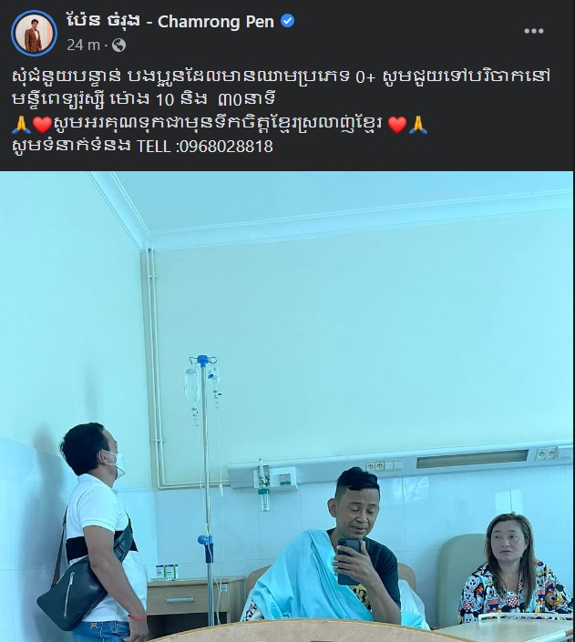 លោក ប៉ែន ចំរ៉ុង សុំជំនួយបន្ទាន់ពីបងប្អូនដែលមានឈាមប្រភេទ o+ ឱ្យជួយបរិច្ចាគឈាមដល់លោក ខាត់ ចំរើន