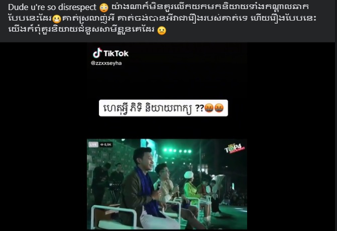 ថុល សុភិទិ ត្រូវអ្នកលេងបណ្តាញសង្គមមួយចំនួនរិះគន់ ក្រោយប្រើពាក្យសម្តីលេងសើចបែបនេះដាក់ ស៊ឹម ច័ន្ទពន្លឺ នៅលើឆាក