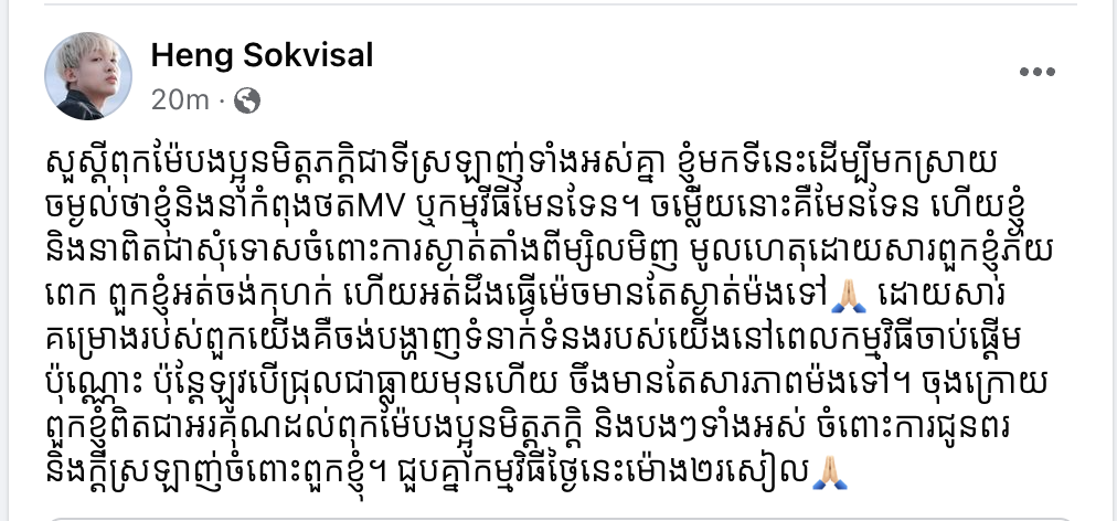 «សួស្តីពុកម៉ែបងប្អូនមិត្តភក្តិជាទីស្រឡាញ់ទាំងអស់គ្នា ខ្ញុំមកទីនេះដើម្បីមកស្រាយចម្ងល់ថាខ្ញុំនិងនាកំពុងថតMV ឬកម្មវីធីមែនទែន។ ចម្លើយនោះគឺមែនទែន ហើយខ្ញុំនិងនាពិតជាសុំទោសចំពោះការស្ងាត់តាំងពីម្សិលមិញ មូលហេតុដោយសារពួកខ្ញុំភ័យពេក ពួកខ្ញុំអត់ចង់កុហក់ ហើយអត់ដឹងធ្វើម៉េចមានតែស្ងាត់ម៉ងទៅ🙏🏻 ដោយសារគម្រោងរបស់ពួកយើងគឺចង់បង្ហាញទំនាក់ទំនងរបស់យើងនៅពេលកម្មវិធីចាប់ផ្តើមប៉ុណ្ណោះ ប៉ុន្តែឡូវបើជ្រុលជាធ្លាយមុនហើយ ចឹងមានតែសារភាពម៉ងទៅ។ ចុងក្រោយពួកខ្ញុំពិតជាអរគុណដល់ពុកម៉ែបងប្អូនមិត្តភក្តិ និងបងៗទាំងអស់ ចំពោះការជូនពរ និងក្តីស្រឡាញ់ចំពោះពួកខ្ញុំ។ ជួបគ្នាកម្មវិធីថ្ងៃនេះម៉ោង២រសៀល🙏🏻»៕