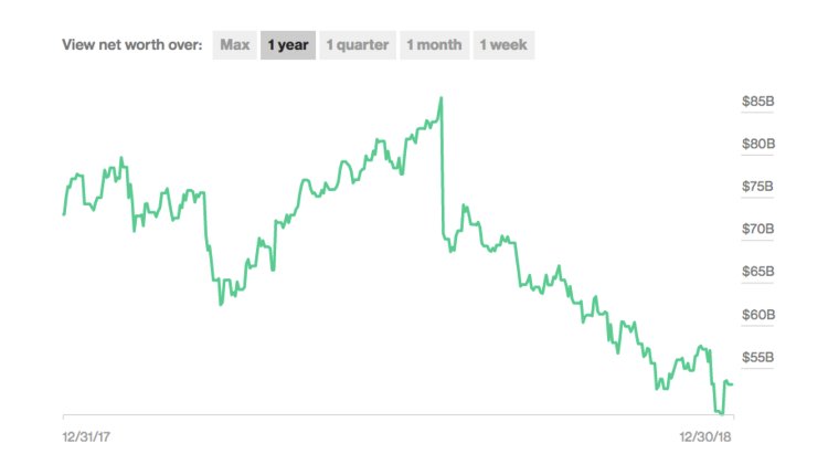 លោក Mark Zuckerberg មានភាគហ៊ុនចំនួន ១៣% នៅក្នុងក្រុមហ៊ុន ហ្វេសប៊ុក ហើយក្នុង ឆ្នាំ២០១៨ លោកត្រូវបានរំខានដោយវិបតិ្តរួមទាំងរឿងអាស្រូវទាក់ទិននឹង Cambridge Analytica, ការចោទប្រកាន់ពីការគ្រប់គ្រងមិនល្អ, ការឱ្យដៃគូរបស់ខ្លួនដឹងពីព័ត៌មានរបស់អ្នកប្រើប្រាស់ និងសំណួរពាក់ព័ន្ធនឹងមាតិកាមិនសមរម្យ។ កាលពីថ្ងៃទី ២៥ ខែកក្កដា តម្លៃភាគហ៊ុនរបស់ ហ្វេសប៊ុក បានធ្លាក់ចុះជាង ២០% បន្ទាប់ពីក្រុមហ៊ុនបានបង្ហាញពីការខកចិត្តនៃប្រាក់ចំណូលក្នុងត្រីមាសទី២។ ចំណុចទាបបំផុតរបស់ភាគហ៊ុន ហ្វេសប៊ុក គឺនៅថ្ងៃទី ២៤ ខែវិច្ឆិកា ដោយទ្រព្យសម្បត្តិរបស់ Zuckerberg គឺធ្លាក់សល់ត្រឹមប្រហែល ៥២ពាន់លានដុល្លារ៕