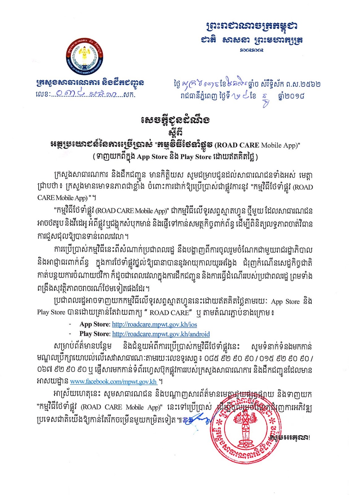 កាលពីថ្ងៃទី១៣ ខែធ្នូ ឆ្នាំ២០១៨ កម្មវិធីថែទាំផ្លូវ (ROAD CARE) ត្រូវបានដាក់សម្ពោធឲ្យដំណើរការជាផ្លូវការ ដោយមានការអញ្ជើញចូលរួម ឯកឧត្តម ស៊ុន ចាន់ថុល ទេសរដ្ឋមន្រ្តីក្រសួងសាធារណការ និងដឹកជញ្ជូន។ កម្មវិធី ROAD CARE នេះត្រូវបានបង្កើតឡើងក្នុងគោលបំណងពង្រឹងទំនាក់ទំនងរវាងអ្នកប្រើប្រាស់ផ្លូវថ្នល់ និងក្រុមការងារជួសជុលថែទាំផ្លូវ បង្កើនទំនួលខុសត្រូវរបស់អាជ្ញាធរមានសមត្ថកិច្ច លើកកម្ពស់គុណភាពផ្លូវ ពង្រីកការចូលរួមពីសាធារណជន បណ្ដុះស្មារតីស្រឡាញ់ថែរក្សាសម្បត្តិជាតិ និងធ្វើជាម្ចាស់ការលើទ្រព្យសម្បត្តិទាំងនោះ។