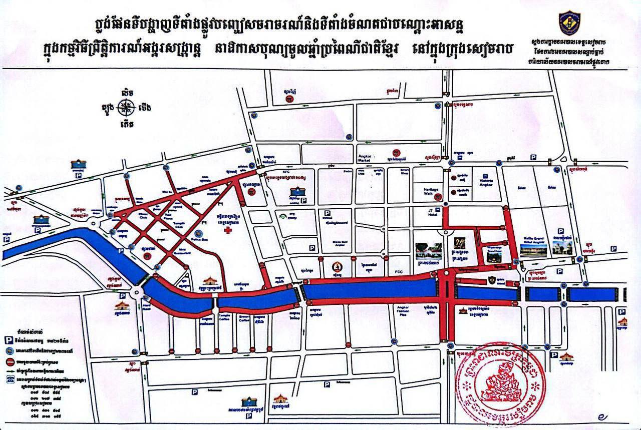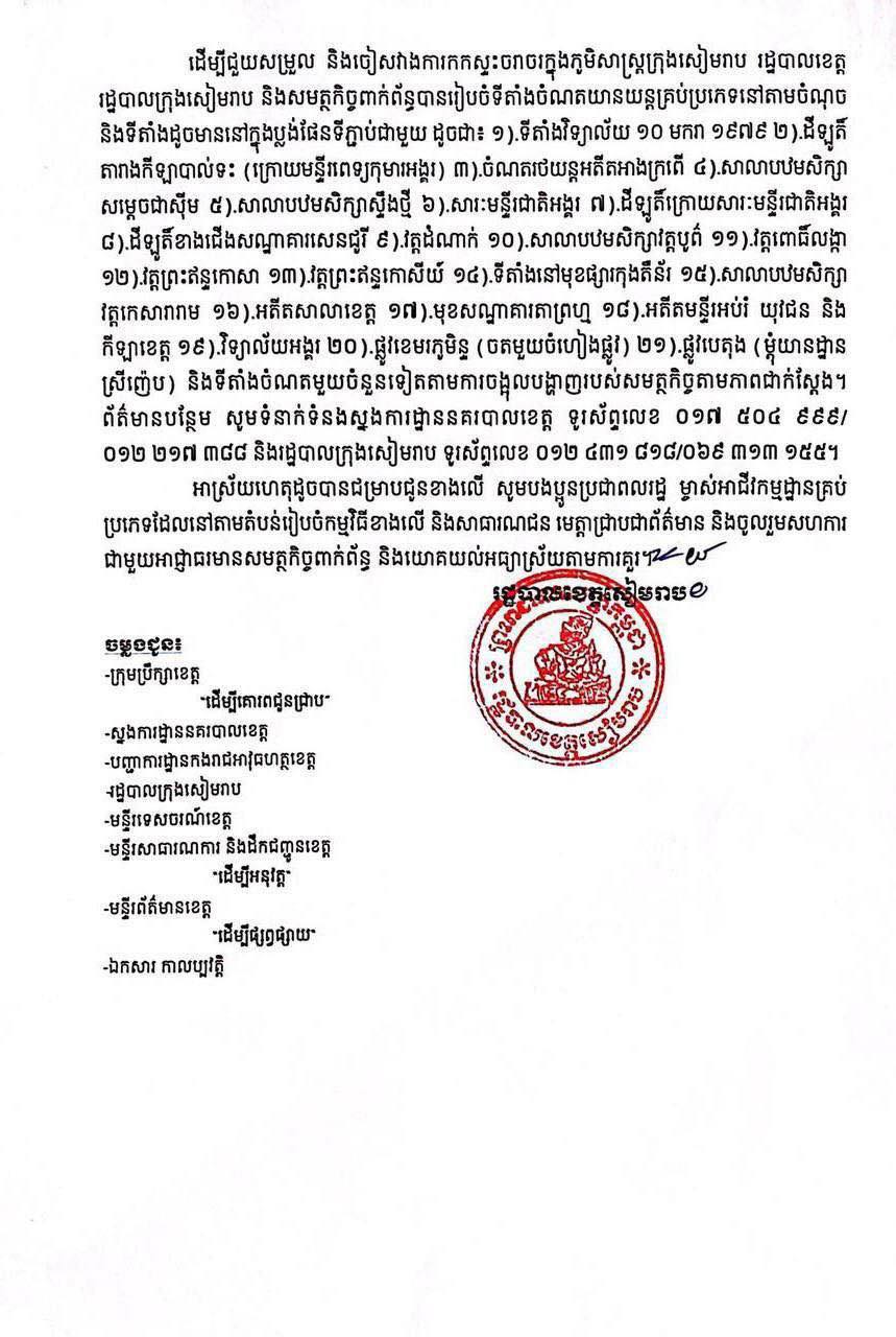 ដើម្បីធានាបាននូវសន្តិសុខ សណ្តាប់ធ្នាប់ របៀបរៀបរយសាធារណៈឱ្យបានល្អប្រសើរ និងចៀសវាងការកកស្ទះចរាចរ រដ្ឋបាលខេត្តសៀមរាប នឹងផ្អាកចរាចរជាបណ្តោះអាសន្នលើកំណាត់ផ្លូវមួយចំនួនក្នុងក្រុងសៀមរាប និងបានរៀបចំចំណត២១កន្លែង ព្រមទាំងទីតាំងចំណតមួយចំនួនទៀតតាមការចង្អុលបង្ហាញរបស់សមត្ថកិច្ចនិងភាពជាក់ស្តែងដូចខាងក្រោម៖