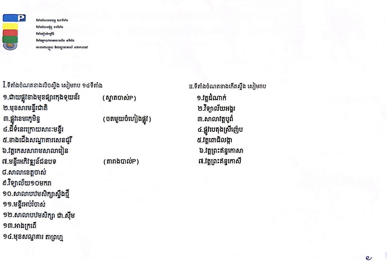 ១.កំណាត់ផ្លូវស៊ីវត្ថា ចាប់ពីចំណុចស្តុបសម្ដេចសង្ឃរាជទេពវង្ស ដល់ចំណុចហាងលក់ សម្លៀកបំពាក់ហ្សានដូ(Zando) និងកំណាត់ផ្លូវក្នុងតំបន់ផាប់ស្ទ្រីត ផ្សារចាស់ ផ្លូវសុខសាន្ត ផ្លូវផ្សាររាត្រី ផ្លូវ២ធ្នូ និងផ្លូវខាងជើងជាប់របងមន្ទីរពេទ្យបង្អែកខេត្តសៀមរាប។