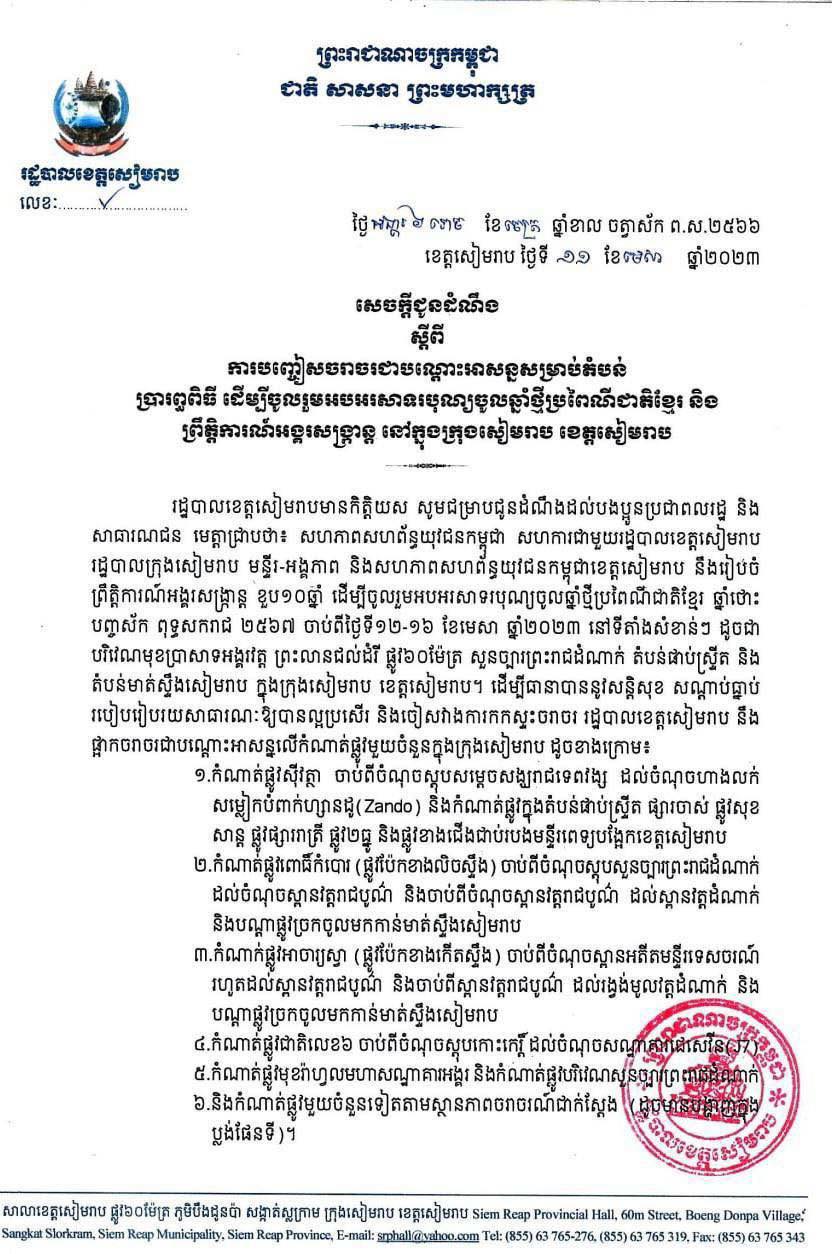 ខេត្តសៀមរាប៖ យោងតាមការចុះផ្សាយរបស់ រដ្ឋបាលខេត្តសៀមរាប បានចេញសេចក្ដីជូនដំណឹងស្តីពីការបញ្ចៀសចរាចរជាបណ្តោះអាសន្នសម្រាប់តំបន់ប្រារព្ធពិធី ដើម្បីចូលរួមអបអរសាទរបុណ្យចូលឆ្នាំថ្មីប្រពៃណីជាតិខ្មែរ និងព្រឹត្តិការណ៍អង្គរសង្ក្រាន្ត នៅក្នុងក្រុងសៀមរាប ខេត្តសៀមរាប។