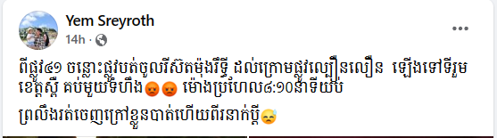 បើយោងតាមគណនីហ្វេសប៊ុកមួយឈ្មោះ Yem Sreyroth បានសរសេររៀបរាប់ថា៖ « ពីផ្លូវ៤១ ចន្លោះផ្លូវបត់ចូលរីសត ម៉ុង ឫទ្ធី ដល់ក្រោមផ្លូវល្បឿនលឿន ឡើងទៅទីរួមខេត្តកំពង់ស្ពឺ គប់មួយទំហឹង ម៉ោងប្រហែល៨៖១០នាទីយប់ ព្រលឹងរត់ចេញក្រៅខ្លួនបាត់ហើយពីរនាក់ប្ដី »។ ក្នុងហេតុការណ៍នេះដែរ មានអ្នកចែករំលែក ក្នុងបណ្ដាញសង្គម​ជាច្រើនផងដែរ និងសូមឱ្យបងប្អូនប្រជាពលរដ្ឋទាំងអស់ ដែលធ្វើដំណើរនៅតាមដងផ្លូវ ត្រូវមានការប្រុងប្រយ័ត្នខ្ពស់ ចៀសវាងកើតមានឡើងនូវហេតុការណ៍នេះជាយថាហេតុ ៕