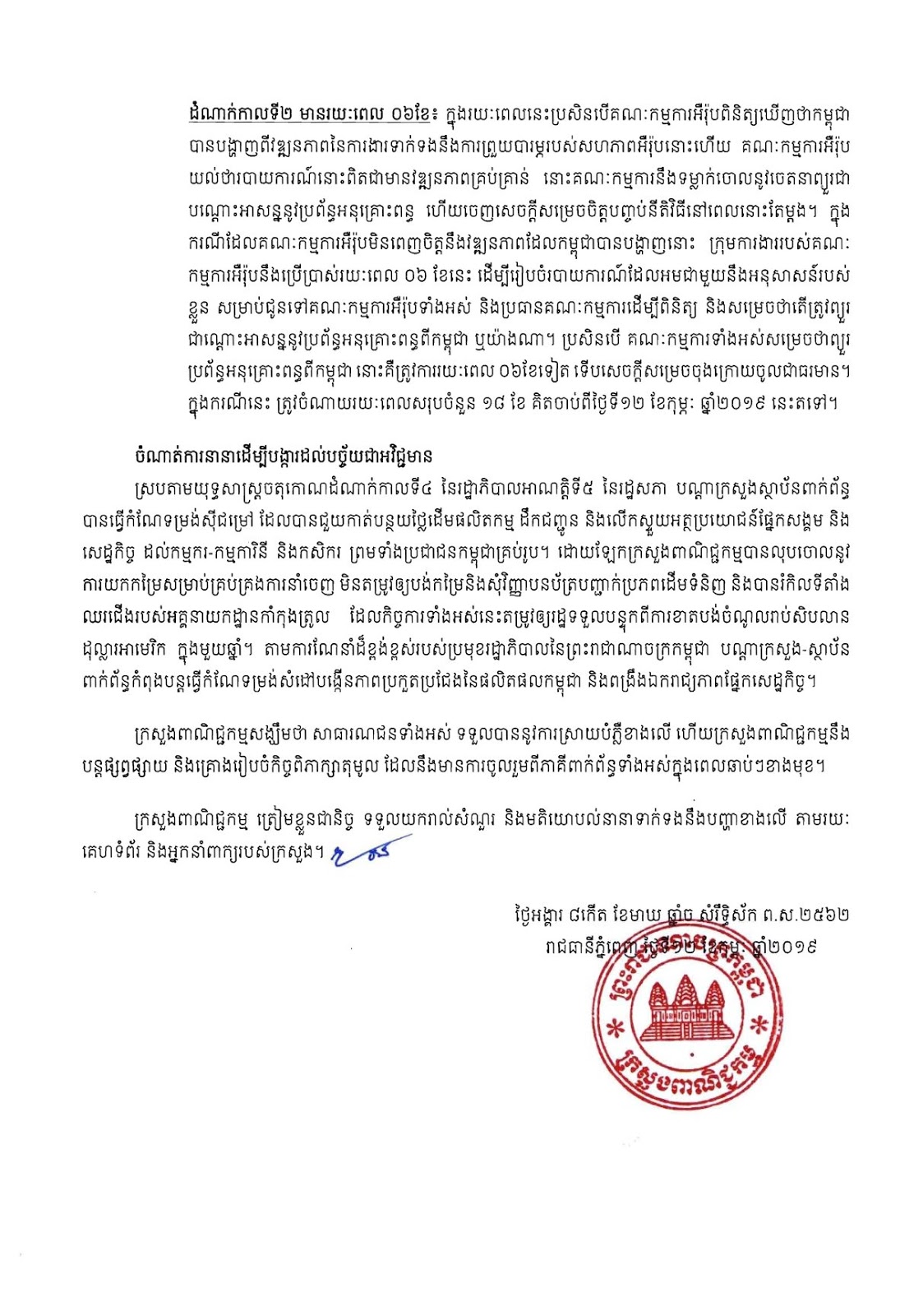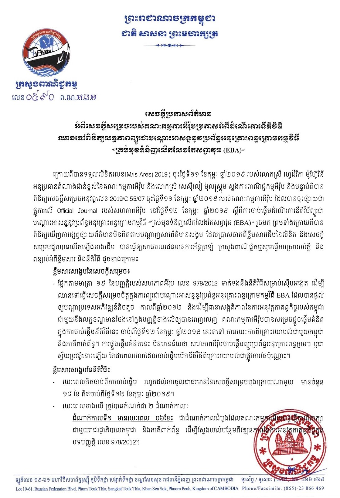 ដោយសារតែពិនិត្យឃើញមានការផ្សព្វផ្សាយព័ត៌មានមិនពិតតាមបណ្តាញសង្គម ដែលប្រាសចាកពីខ្លឹមសារដើមនៃលិខិត និងសេចក្តីសម្រេចនៃការព្យួរជាបណ្តោះអាសន្ននូវប្រព័ន្ធអនុគ្រោះពន្ធក្រោមកម្មវិធី «គ្រប់មុខទំនិញលើកលែងតែសព្វាវុធ (EBA)» ដែលបានធ្វើឲ្យសាធារណជនមានការភ័ន្តច្រឡំ ទើបកាលពីយប់ថ្ងៃទី១២ ខែកុម្ភៈ ឆ្នាំ២០១៩ ម្សិលមិញនេះ ក្រសួងពាណិជ្ជកម្ម បានចេញសេចក្តីប្រកាសមួយ ដើម្បីធ្វើការស្រាយបំភ្លឺ និងពន្យល់អំពីខ្លឹមសារ និងនីតិវិធីទាក់ទងសេចក្តីសម្រេចរបស់គណៈកម្មការ​អឺរ៉ុប ប្រកាសអំពីដំណើរការនីតិវិធី​ឈានទៅពិនិត្យលទ្ធភាពព្យួរជាបណ្តោះអាសន្ននូវប្រព័ន្ធអនុគ្រោះពន្ធក្រោមកម្មវិធី «គ្រប់មុខទំនិញលើកលែងតែសព្វាវុធ (EBA)» ដែលមានខ្លឹមសារដូចខាងក្រោម៖