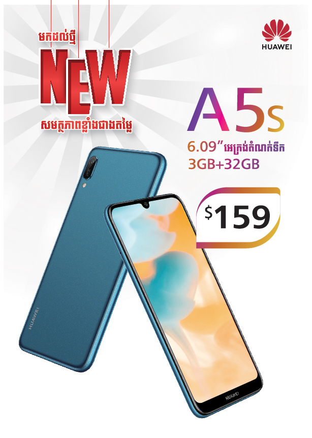ភ្នំពេញ ថ្ងៃទី 26 កុម្ភះ ឆ្នាំ 2019 ៖ បន្ទាប់ពីស្មាតហ្វូន Huawei អេ 7 បានចូលមកអង្រួនទីផ្សារស្មាតហ្វូនលំដាប់ថវិកានៅប្រទេសកម្ពុជាឲ្យកក្រើក និងទទួលបានការពេញនិយមបំផុតនៅដើមឆ្នាំ 2019 នេះ ក្រុមហ៊ុន Huawei បានបង្ហាញវត្តមានត្រកូលអេ ថ្មីមួយម៉ូដែលទៀត គឺ Huawei អេ 5s ដែលចាប់ផ្តើមកុម្មង់ទិញទុកមុនចាប់ពីថ្ងៃនេះតទៅក្នុងតម្លៃត្រឹមតែ $159 តែប៉ុណ្ណោះ ថែមទាំងទទួលបានកាសកាលីបទាន់សម័យមួយឥតគិតថ្លៃ។ Huawei អេ 5s មានចំណុចពិសេស 6 ចំណុចដែលអតិថិជនមិនគួរមើលរំលង៖