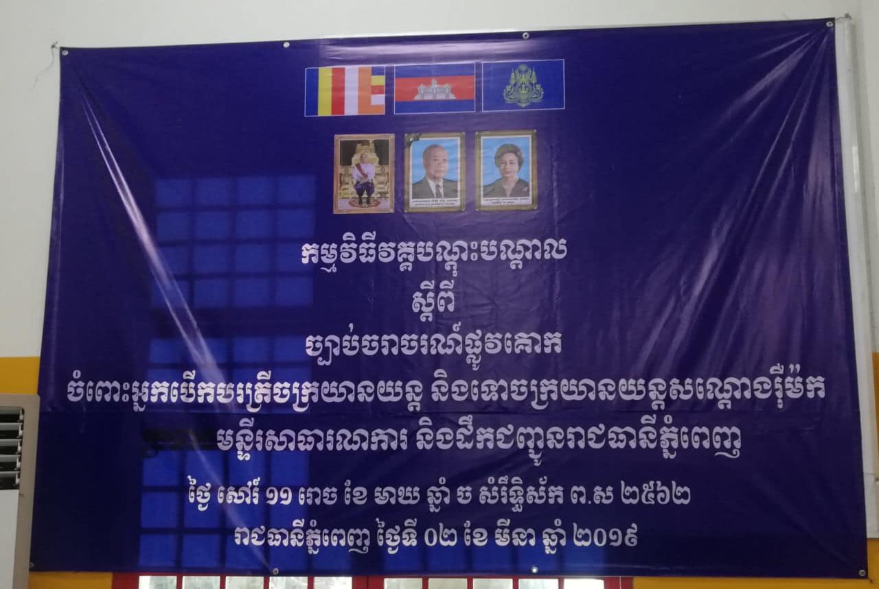 កាលពីពេលថ្មីៗនេះ រដ្ឋបាលរាជធានីភ្នំពេញ បានចាត់ឲ្យមន្ទីរសាធារណការ និងដឹកជញ្ចូនរាជធានីភ្នំពេញ រៀបចំបើកវគ្គបណ្តុះបណ្តាលច្បាប់ចរាចរណ៍ផ្លូវគោកជូនដល់អ្នកបើកបរត្រីចក្រយានយន្ត និងទោចក្រយានយន្តសណ្តោងរ៉ឺម៉ក ដោយឥតគិតថ្លៃ ដើម្បីចូលរួមកាត់បន្ថយគ្រោះថ្នាក់ចរាចរណ៍ធានាបាននូវសុវត្ថិភាពដល់អ្នកដំណើរ និងដឹកជញ្ចូនរាជធានីភ្នំពេញ និងដើម្បីឲ្យការធ្វើចរាចរស្របតាមច្បាប់ចរាចរណ៍ផ្លូវគោក។