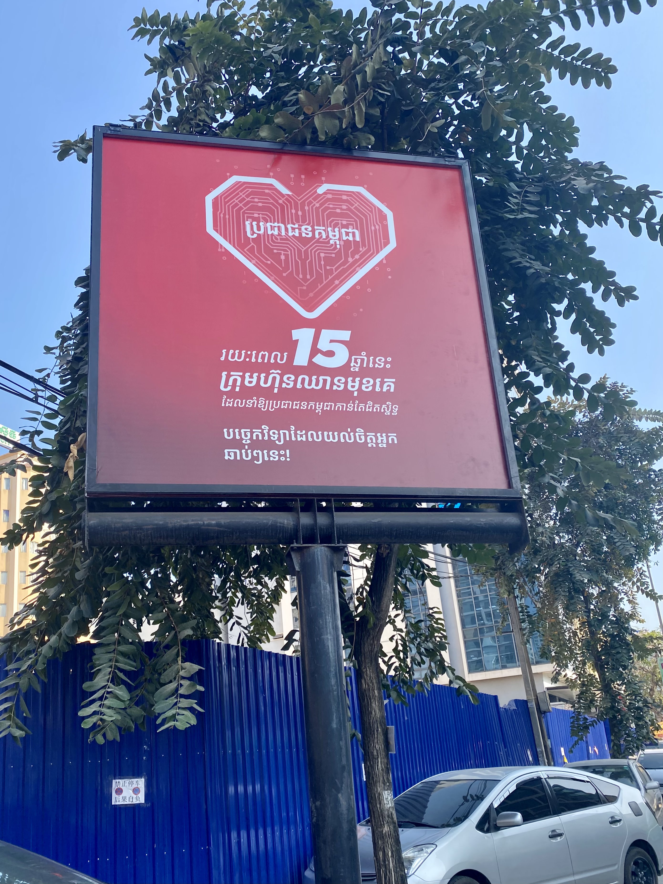 ជិះកាត់ក៏ក្រឡេកមើល ឈប់ស្តុប ក៏ងាកមើលហើយអាន បើសោភ័ណភាពគួរចាប់អារម្មណ៍ជាមួយនឹងពាក្យសរសេរធំៗនៅលើប៉ាដាថា «ប្រជាជនកម្ពុជា» ដែលមានបេះដូងដ៏ធំហ៊ុមព័ទ្ធជុំវិញយ៉ាងស្រស់ស្អាត គួបផ្សំជាមួយអក្សរដ៏មានអត្ថន័យទាក់ទាញនៅខាងក្រោម «រយៈពេល 15 ឆ្នាំនេះ ក្រុមហ៊ុនឈានមុខគេ ដែលនាំឱ្យប្រជាជនកម្ពុជាកាន់តែជិតស្និទ្ធ បច្ចេកវិទ្យាដែលយល់ចិត្តអ្នក ឆាប់ៗនេះ» គ្រប់គ្នាពិតជាចង់ដឹងថា តើប៉ាដាក្រហមឆើតឆាយនេះ ចង់ផ្សព្វផ្សាយពីអ្វី តើនឹងមានអ្វីនឹងកើតឡើងក្នុងពេលឆាប់នេះ។