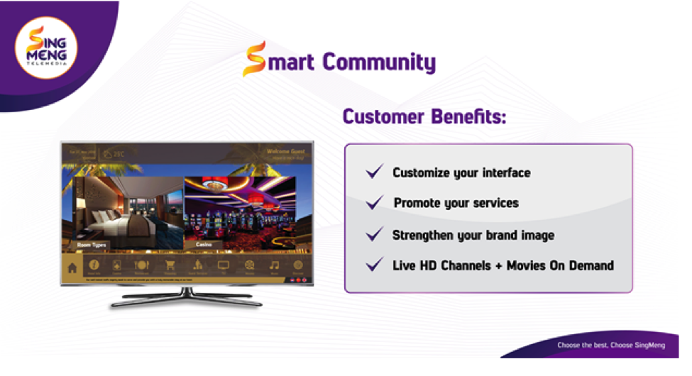 យើងផ្តល់ជូននូវឱកាសសម្រាប់អ្នកគ្រប់គ្រងសណ្ឋាគារ និងខុនដូ ដើម្បីទទួលបាននូវដំណោះស្រាយ ដែលមានគុណភាពខ្ពស់ហើយចំណាយតិចលើការវិនិយោគ និងការថែទាំក្នុងពេលតែមួយ។ Triple Play Solution និង Smart community គឺបង្ហាញថាគ្មានទៀតទេ សម្រាប់ពាក្យថាបច្ចេកវិទ្យាហួសសម័យ។ គំនិតថ្មីនេះបានបើកទ្វារទៅកាន់បទពិសោធន៍ឌីជីថលបែបថ្មី ដែលបង្ករភាពងាយ ស្រួលសម្រាប់សេវាកម្មអ៉ីនធើណិតល្បឿនលឿន អាចទុកចិត្តបាន និងរីករាយជាងមុន។