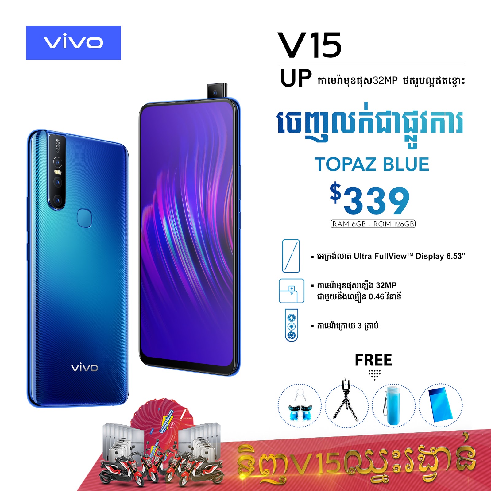 សម្រាប់ការជាវទៅលើស្មាតហ្វូន V15 និងមានបន្ថែមជូនដល់អតិថិជន នូវកាដូពិសេសៗជាច្រើន រួមមានដូចជា បន្តោងសោរ vivo ជើង Tripods ដបទឹកដ៏ស្រស់ស្អាត និង Power Bank ផងដែរ។ មិនតែប៉ុណ្ណោះរាល់ការជាវ V15 លោកអ្នកនិងទទួលបានការផ្តល់ជូនបណ្ណធានាប្តូរ អេក្រង់ដោយឥតគិតថ្លៃ 1ដងផងដែរ ដែលមានសុពលភាព 12ខែ។ ជាពិសេស ក៏មានបន្ថែមនូវការធានាទូរស័ព្ទ រហូតដល់ទៅ 24ខែ គិតចាប់ពីថ្ងៃដែលទិញ។ ពិសេសជាងនេះទៅទៀតនោះក្រុមហ៊ុនក៏នឹង ផ្តល់ជូនប័ណ្ណផ្សងសំណាង ចាប់រង្វាន់ជាច្រើនដូចជា៖ ម៉ូតូ Honda Zoomer-X ស៊េរីថ្មី ចំនួន 5 រង្វាន់ វ៉ាលីម៉ាក Rimowa ចំនួន 10 រង្វាន់ និងទូទឹកកកម៉ាក Midea ចំនួន 15 រង្វាន់។ កាលបរិច្ឆេទចាប់រង្វាន់ ប្រព្រឹត្តទៅ នៅថ្ងៃទី26 ខែមីនា រហូតដល់ថ្ងៃទី30 ខែមេសា ឆ្នាំ2019។ រួសរាន់ឡើងសំណាងអាចក្លាយជាអ្នក!!!