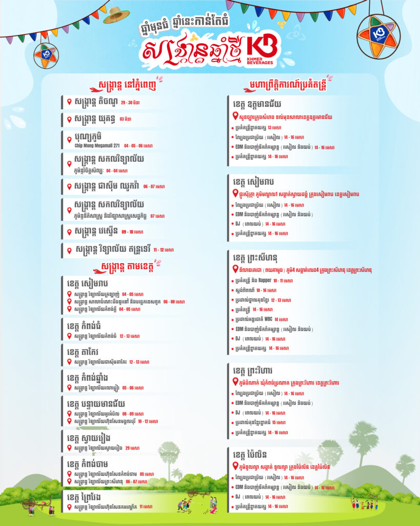 ជាមួយការចូលរួមឧបត្ថម្ភគាំទ្រពី ខ្មែរ ប៊ែវើរីជីស សង្រ្កាន្តជាច្រើននៅតាមតំបន់ផ្សេងៗ នឹងចាប់ប្រារព្ធឡើង ពីចុងខែមីនា រហូតដល់ពាក់កណ្តាលខែមេសា រួមមានដូចជា សង្ក្រាន្តវិទ្យាល័យ សង្ក្រាន្តសកលវិទ្យាល័យ សង្ក្រាន្តតាមខេត្ត ជាពិសេស គឺព្រឹត្តិការណ៍អង្គរសង្រ្កាន្តនៅខេត្តសៀមរាប និង មហោស្រពបុណ្យភូមិផងដែរ។ មិនតែប៉ុណ្ណោះ មហាព្រឹត្តិការណ៍ប្រគំតន្រ្តីទេសចរណ៍ធំៗទាំង ៤ របស់ក្រុមហ៊ុន ខ្មែរ ប៊ែវើរីជីស នឹងមានវត្តមាននៅ ៥ ខេត្តខុសៗគ្នា រយៈពេល ៣ ថ្ងៃ ដែលបងប្អូននឹងបានកំសាន្តសប្បាយ តាមបែបប្រជាប្រិយខ្មែរ ក៏ដូចជាបែបសម័យថ្មី ក្នុងឱកាសអបអរសាទរបុណ្យចូលឆ្នាំខ្មែរប្រពៃណីជាតិខាងមុខ។