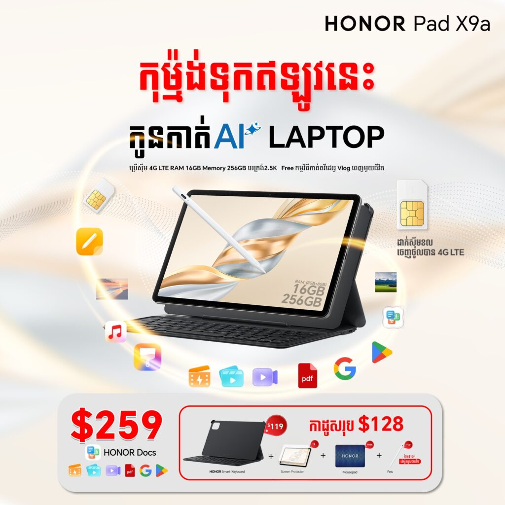 សម័យនេះហើយគួរតែបន្តប្រើឡេបថប់ ឬក៏ផ្លាស់ប្តូរមកប្រើ ថេប្លេតអេក្រង់2.5K HONOR Pad X9a កូនកាត់ AI Laptop ប្រើស៊ីមកាត រ៉េម16ជី ម៉េម៉ូរី256ជី Speak4គ្រាប់ ថ្មកាន់ខ្លាំង ល្បឿនសាកថ្មលឿន 35W មួយកំភ្លេជំនួសវិញ?