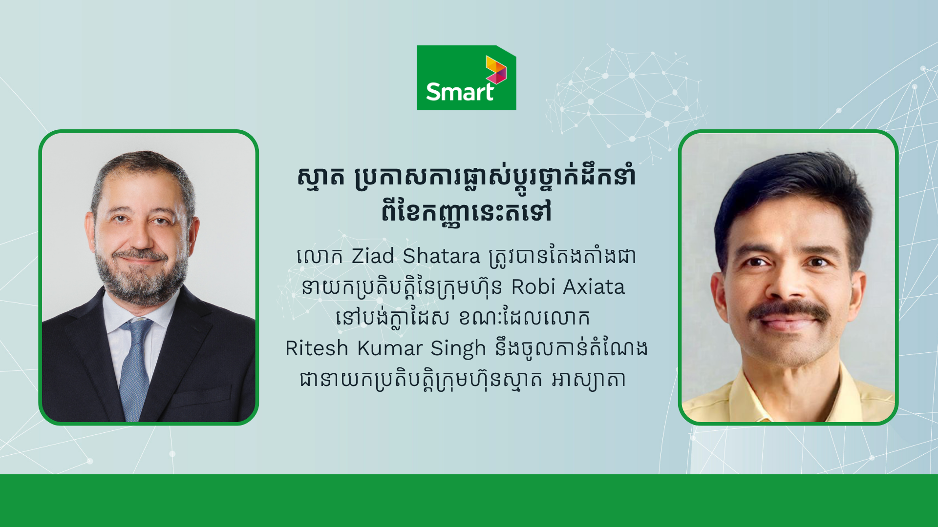 ស្មាត ប្រកាសការផ្លាស់ប្តូរថ្នាក់ដឹកនាំពីខែកញ្ញានេះតទៅ៖ លោក Ziad Shatara ត្រូវបានតែងតាំងជានាយកប្រតិបត្តិនៃក្រុមហ៊ុន Robi Axiata នៅបង់ក្លាដែស ខណៈដែលលោក Ritesh Kumar Singh នឹងចូលកាន់តំណែងជានាយកប្រតិបត្តិក្រុមហ៊ុនស្មាតអាស្យាតា
