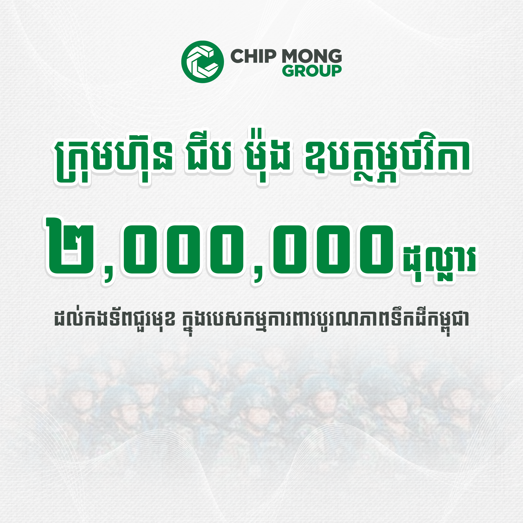 មិនតែប៉ុណ្ណោះ ក្រុមហ៊ុន ជីប ម៉ុង ដែលជាក្រុមហ៊ុនមេរបស់ ខ្មែរ ប៊ែវើរីជីស និងពាណិជ្ជកម្មសុរបជាង ១៤ បានប្រកាសឧបត្ថម្ភថវិកាសរុប ២ លានដុល្លារបន្ថែមទៀត ទៅដល់កងទ័ពជួរមុខកម្ពុជា ដែលកំពុងឈរជើងនៅតាមបណ្តោយព្រំដែនកម្ពុជា-ថៃ។