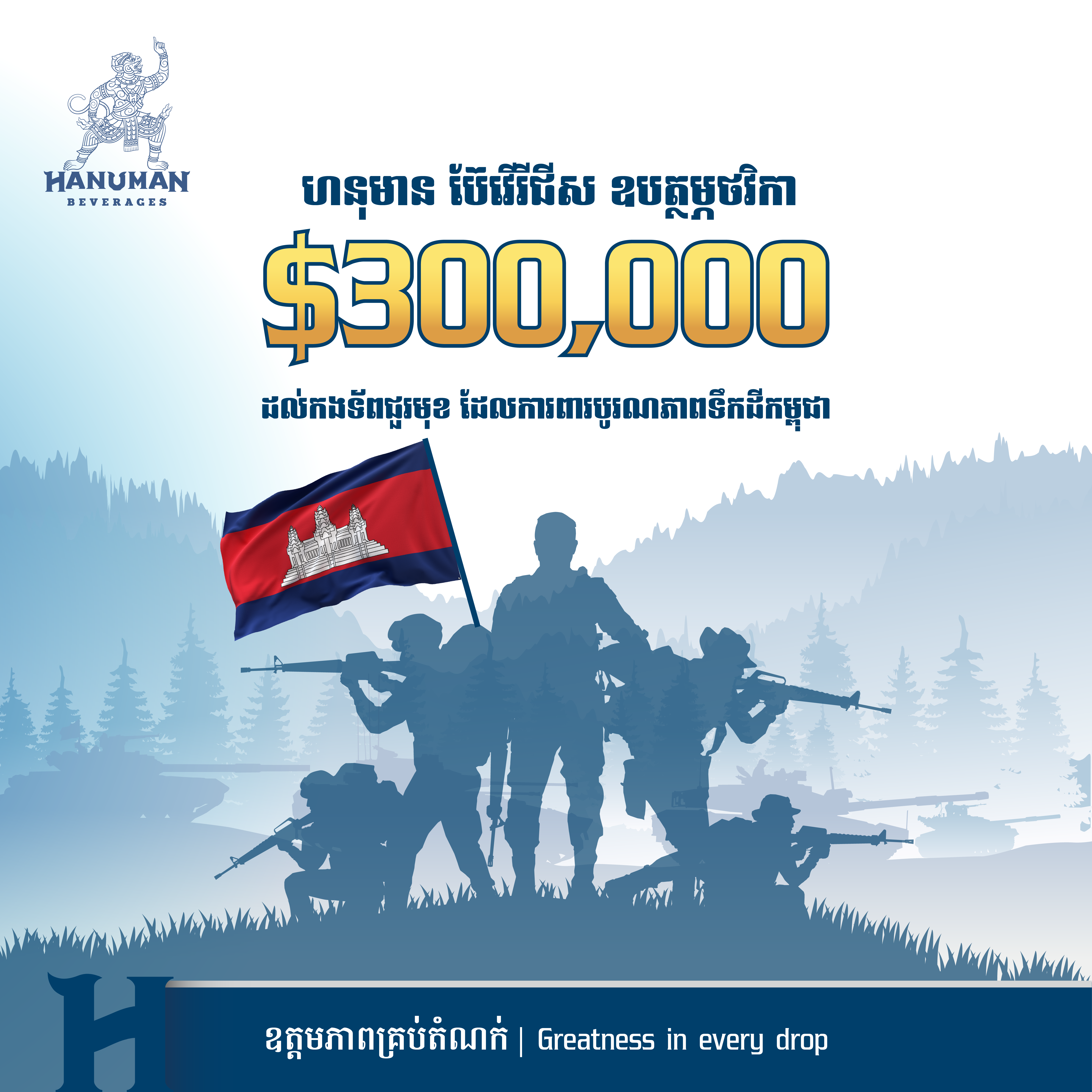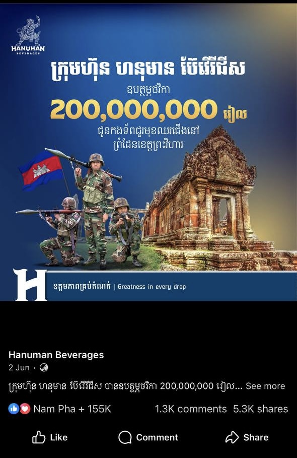 ភ្នំពេញ៖ ដើម្បីបង្ហាញពីការដឹងគុណ និងលើកទឹកចិត្តដល់វីរកងទ័ពជួរមុខកម្ពុជាដ៏អង់អាចក្លាហាន ក្រុមហ៊ុនហនុមានបានប្រកាសឧបត្ថម្ភថវិកាជាលើកទី២តាមរយៈរាជរដ្ឋាភិបាលចំនួន US$300,000 បន្ថែមទៀត បន្ទាប់ពីការបរិច្ចាគលើកទី 1 ចំនួន 200លានរៀល (ស្មើនឹង ៥ម៉ឺនដុល្លារ) កាលពីថ្ងៃទី02 មិថុនា 2025។ សរុបថវិកាទាំងពីរលើក ក្រុមហ៊ុន ហនុមាន ប៊ែវើរីជីស បានឧបត្ថម្ភចំនួន $350,000(សាមសិបប្រាំម៉ឺនដុល្លារអាមេរិក)។