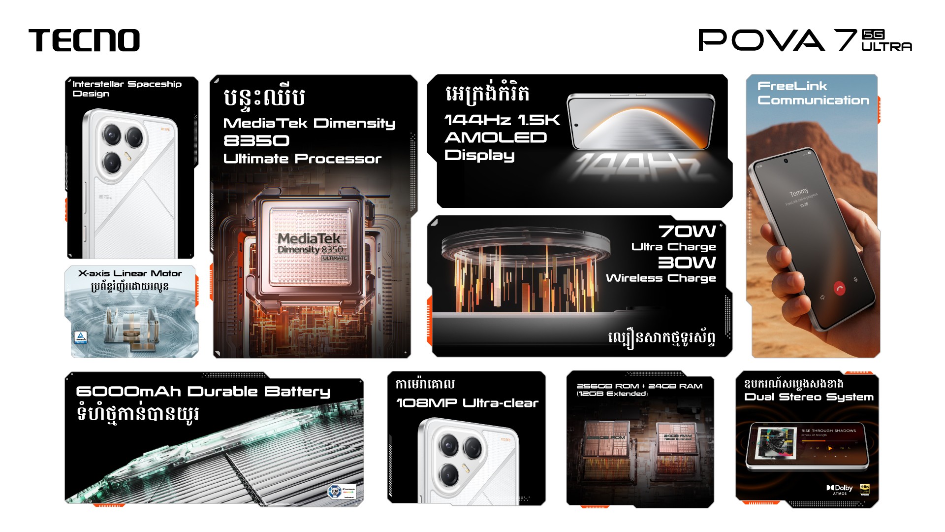 ក្រុមហ៊ុន TECNO Mobile បានប្រកាសចេញនូវ ស្មាតហ្វូនស៊េរីថ្មី TECNO POVA 7 Ultra 5G នៅក្នុងទីផ្សារកម្ពុជាហើយ នៅT.Y Media E-Sports Center ក្រោមវត្តមានអាយដលក្នុងវិស័យហ្គេម ដូចជា ក្រុម MLBB Profesional Players “CFU Gaming” ដែលជាជើងឯកMPL KH រដូវកាលទី៨, ក្រុមនារី CPU Serendipity, លោក Ice frog, លោក Mengly កញ្ញា Sea Neang ពិធិករល្បីលាញ លោកជាវណ្ណារិទ្ធិ ព្រមទាំងTop Fans របស់ TECNO និង វត្តមានសារព័ត៌មានធំៗជាច្រើនស្ថាប័នផងដែរ។