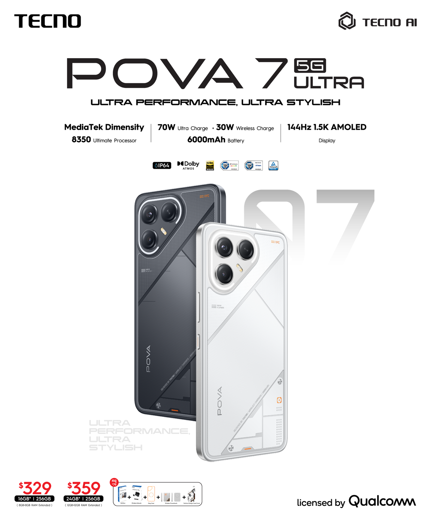 ស្មាតហ្វូនស៊េរីថ្មីនេះ TECNO POVA 7 Ultra 5G ដែលជា ស្មាតហ្វូនលេងហ្គេមបំពាក់ឈីបខ្លាំង5G ដែលមានស្ទាយ៍ទាក់ទាញបំផុត ក្នុងកម្រិតតម្លៃខ្ទង់ 300 ដុល្លា។