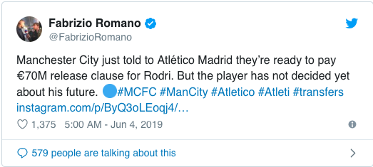 គួរបញ្ជាក់ផងដែរថា ក្លឹប Manchester City បានផ្តល់ដំណឹងអោយក្លឹប Atletico Madrid សម្រាប់ការសំរេចចិត្តរបស់ពួកគេក្នុងការនាំយកកីឡាករ Rodri នៅក្នុងតំលៃ ៧០លានអឺរ៉ូ ប៉ុន្តែទោះជាយ៉ាងណាការសម្រេចមួយនេះនៅមិនទាន់ច្បាស់ការទាំងស្រុងនោះទេគឺស្ថិតនៅលើល័ក្ខខ័ណ្ឌរបស់កីឡាករមួយទៀត។ ជាមួយគ្នានេះដែរ Rodri បានប្តូរចូលពីក្លឹប Villareal ទៅក្លឹប Atletico នៅក្នុងដើមរដូវកាល ២០១៨/១៩។ កីឡាករសញ្ជាតិអេស្ប៉ាញមួយនេះបានក្លាយជាចំនាប់អារម្មណ៍របស់លោក Pep Guardiola បន្ទាប់ពីលេងបានមួយរដូវកាលអោយក្រុម At. Madrid រួចមកខណៈដែរបច្ចុប្បន្ននេះលោក Pep កំពុងតែរកកីឡាករមកជំនួសកីឡាករខ្សែបម្រើ Fernandinho ហើយឥឡូវនេះក្លឹប Man City ត្រូវបានរាយការណ៍ថាយល់ព្រមក្នុងការដាក់តំលៃខ្លួនទៅលើកីឡាករ ហើយនៅចាំតែចម្លើយរបស់កីឡាករវ័យ២២ឆ្នាំរូបនេះប៉ុណ្ណោះ៕