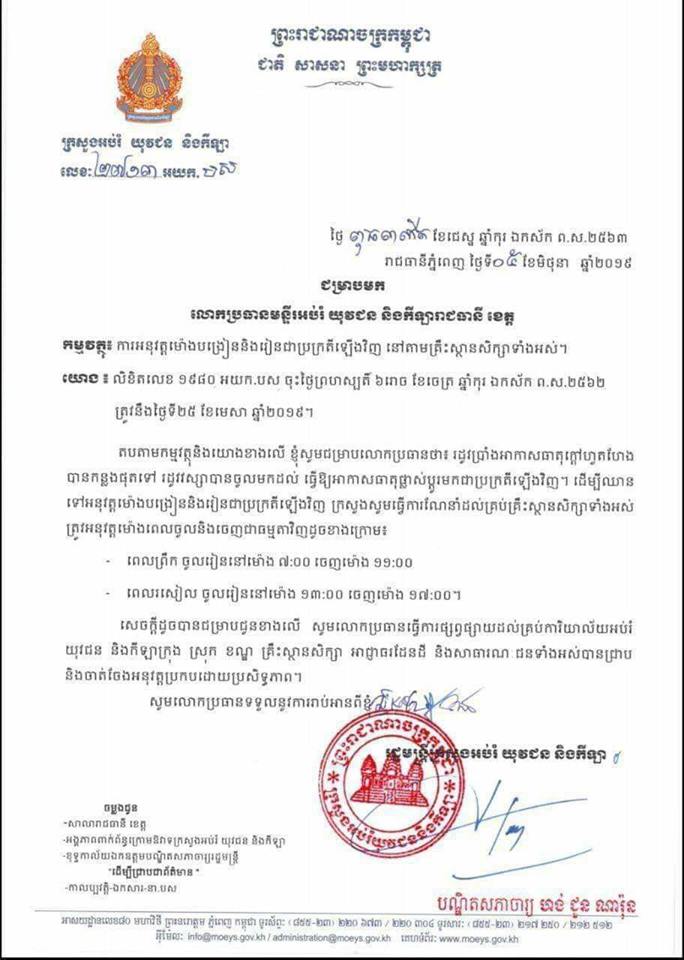 ក្រសួងអប់រំ យុវជន និងកីឡា ស្នើសុំគ្រឹះស្ថានសិក្សាអនុវត្តម៉ោងពេលបង្រៀន និងរៀននៅតាមជាធម្មតាវិញបន្ទាប់ពី រដូវប្រាំងអាកាសធាតុក្តៅ បានកន្លងផុតទៅ នេះបើយោងតាមការប្រកាសរបស់ក្រសួងអប់រំ។ ដោយគ្រប់គ្រឹះស្ថានសិក្សាទាំងអស់ត្រូវអនុវត្តម៉ោងពេលចូល និងចេញជាធម្មតាវិញដូចខាងក្រោម៖