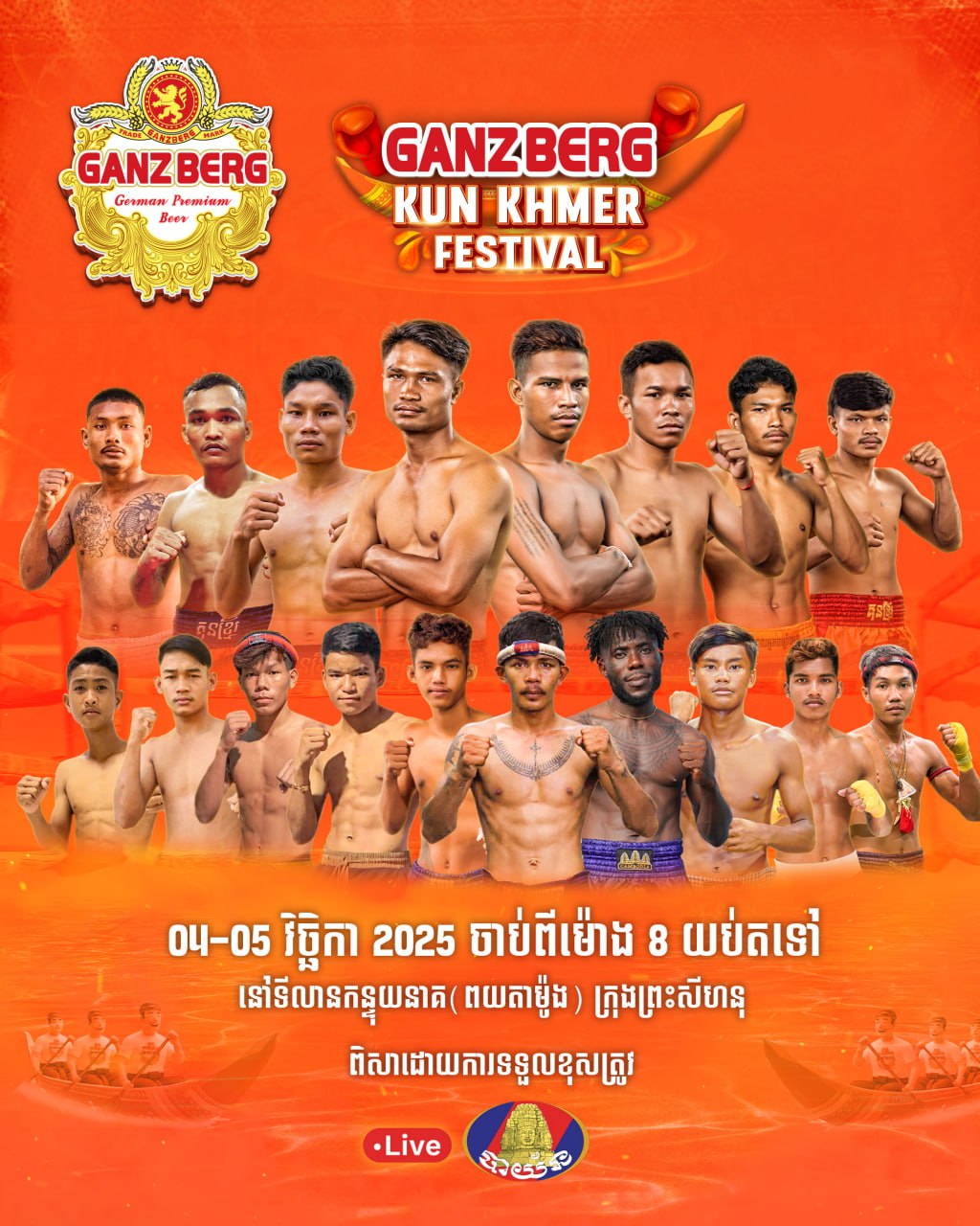 (ក្រុងព្រះសីហនុ)៖ ដំណឹងដ៏កក្រើកមួយសម្រាប់អ្នកស្នេហាវិស័យកីឡាប្រដាល់គុនខ្មែរ! មហាព្រឹត្តិការណ៍ប្រដាល់ដ៏ធំ GANZBERG KUN KHMER FESTIVAL នឹងត្រូវបានរៀបចំឡើងយ៉ាងមហោឡារិកនៅទីលានពយតាម៉ូង ក្រុងព្រះសីហនុ ខេត្តព្រះសីហនុ រយៈពេលពីរថ្ងៃជាប់គ្នា គឺនៅថ្ងៃអង្គារ ទី០៤ និងថ្ងៃពុធ ទី០៥ ខែវិច្ឆិកា ឆ្នាំ២០២៥។