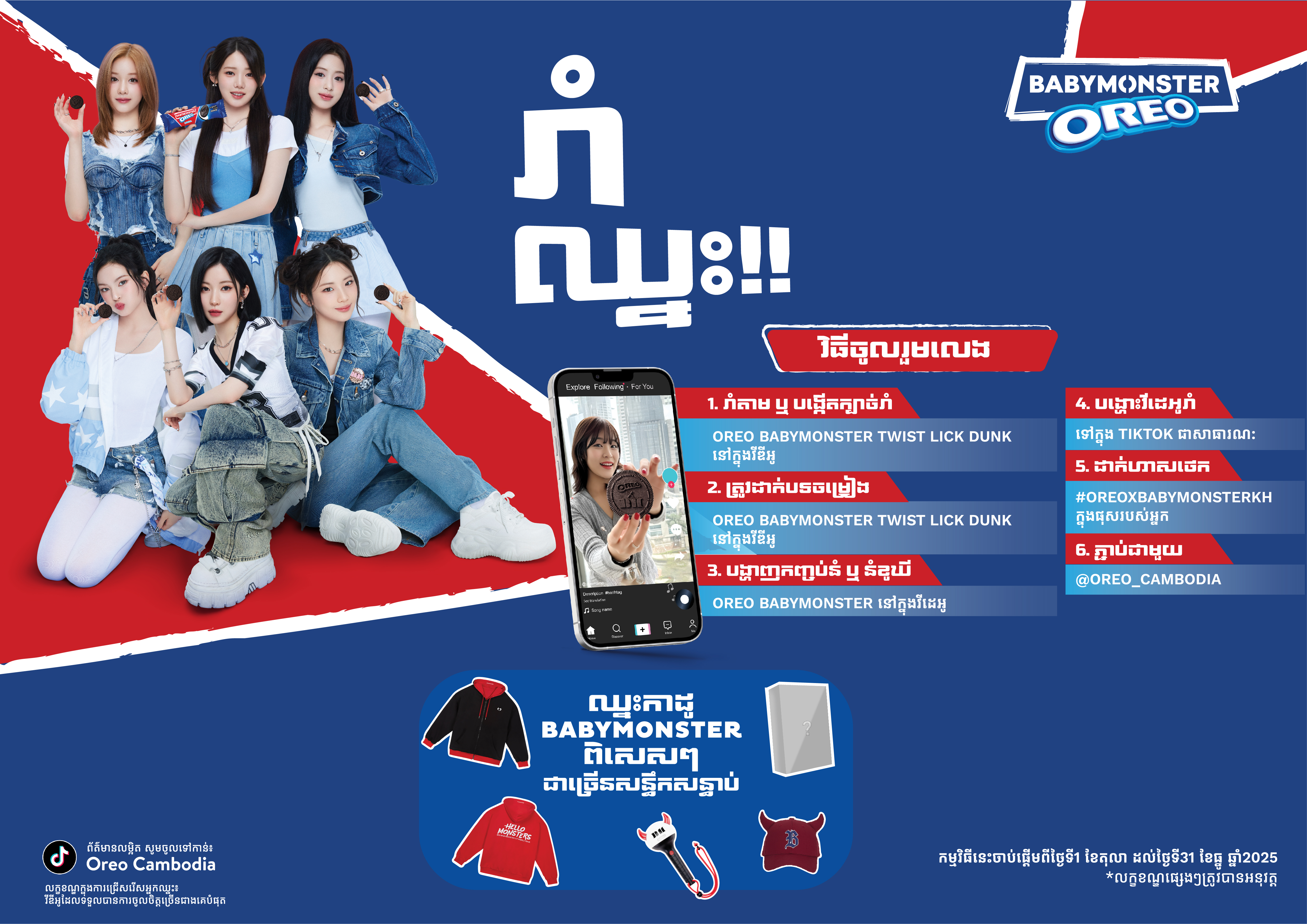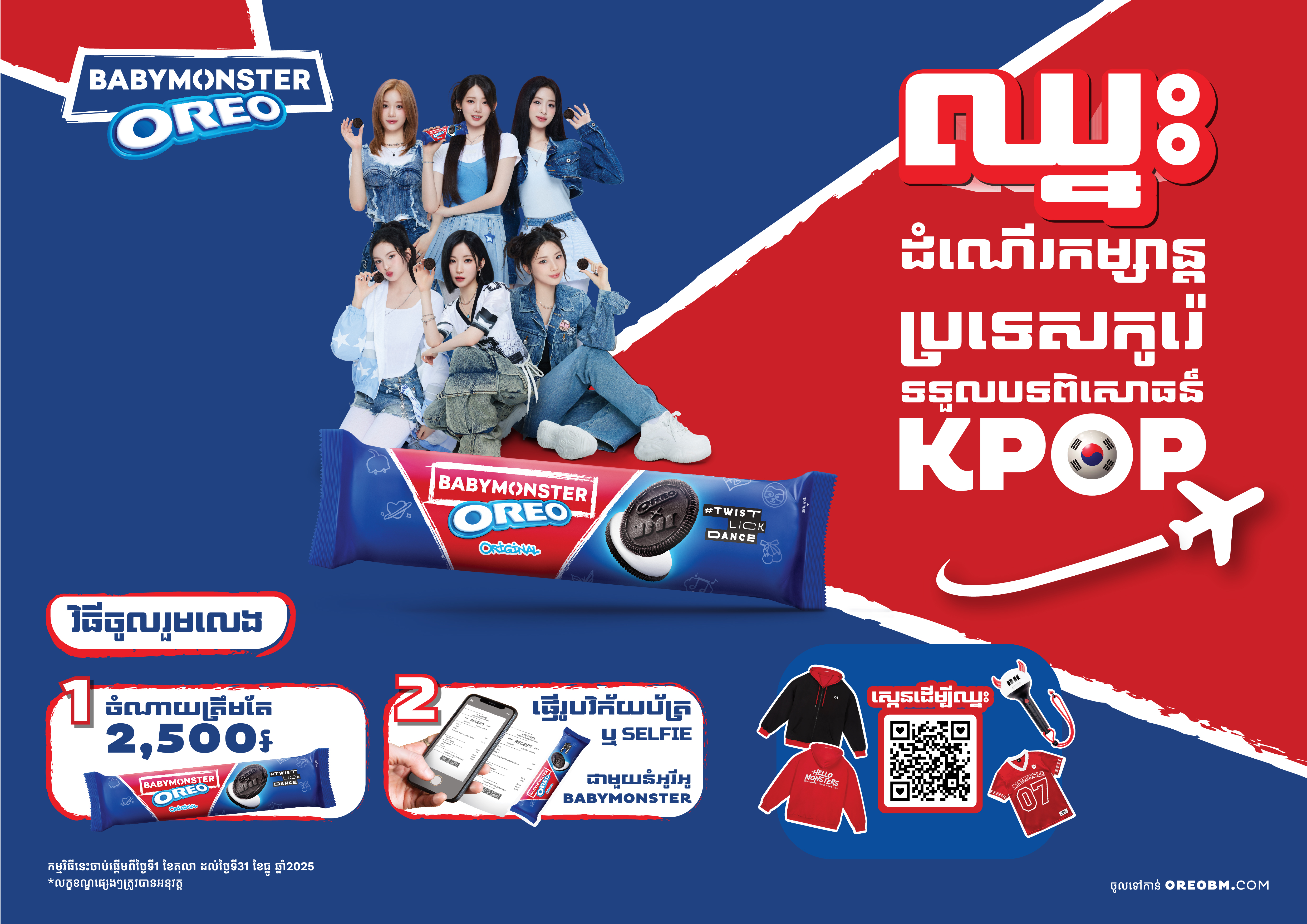 ពេលវេលាពិសេស និងអស្ចារ្យសម្រាប់អ្នកដែលស្រឡាញ់ក្រុមតារា K-pop កូរ៉េនៅកម្ពុជាគ្រប់រូប ជាពិសេសអ្នកគាំទ្ររបស់ក្រុមនារី K-pop BABYMONSTER! BABYMONSTER កំពុងធ្វើការសហការដ៏ធំជាមួយ OREO និងនាំមកនូវការប្រកួត OREO X BABYMONSTER ដែលនឹងចាប់ផ្តើមនៅថ្ងៃទី 1 ខែតុលានេះរហូតដល់ថ្ងៃទី 31 ខែធ្នូ ឆ្នាំ 2025។