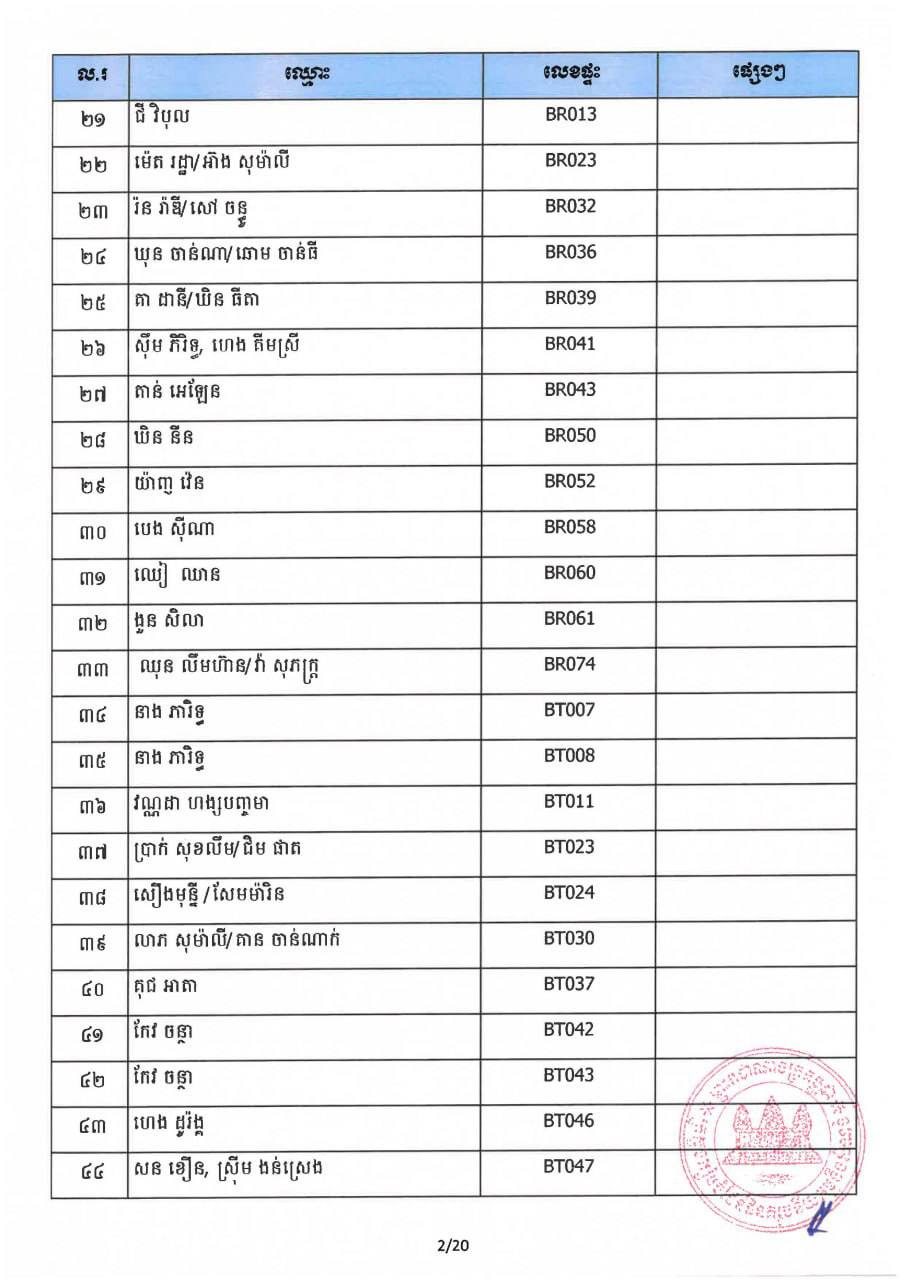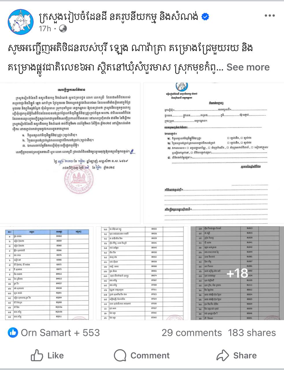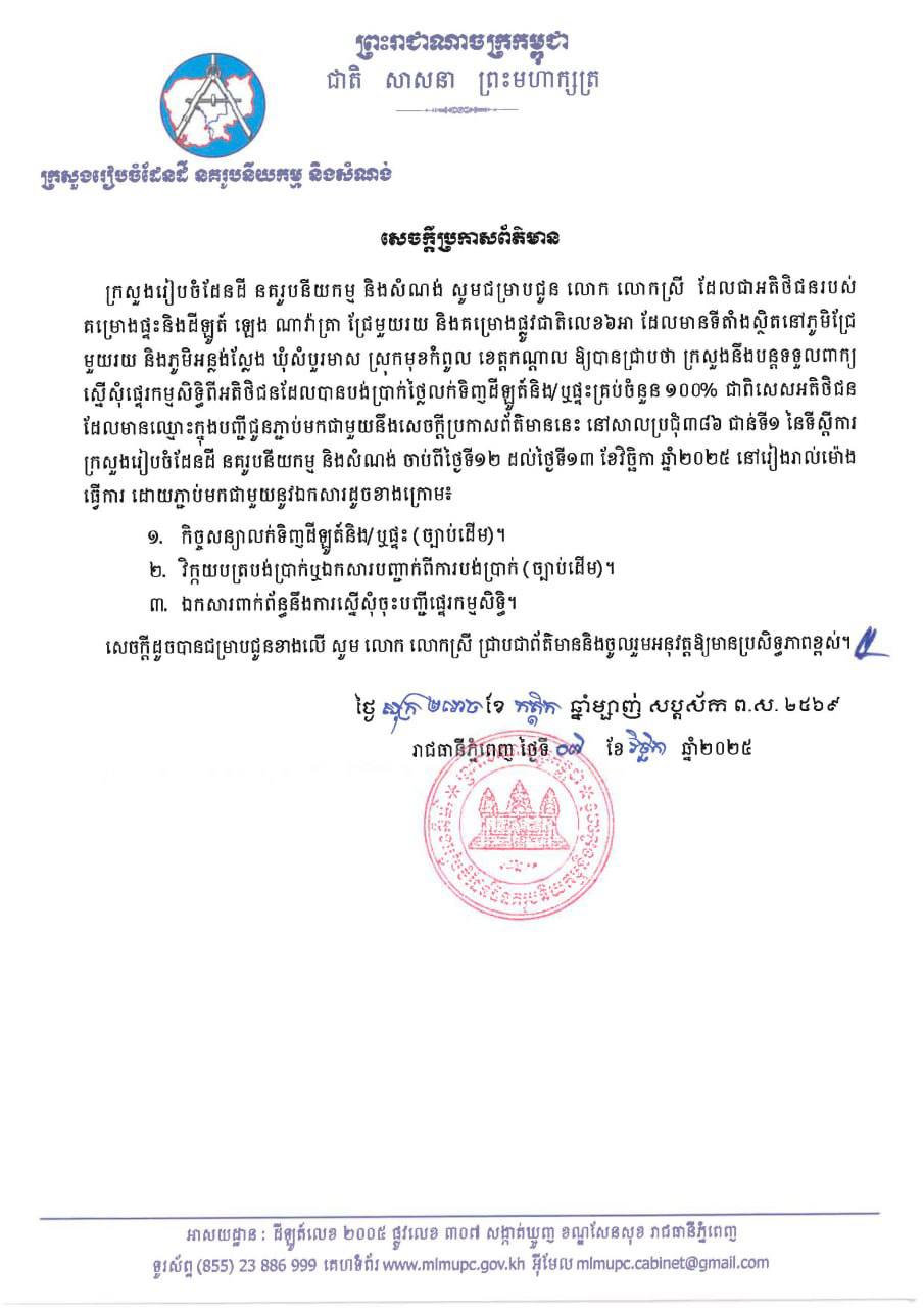 ក្រសួងរៀបចំដែនដី នគរូបនីយកម្ម និងសំណង់ កាលពីថ្ងៃទី០៧ ខែវិច្ឆិកា ឆ្នាំ២០២៥ បានប្រកាសឲ្យអតិថិជនដែលបានបង់ប្រាក់ថ្លៃលក់ទិញដីឡូត៍និង/ឬផ្ទះគ្រប់ចំនួន ១០០% ជាពិសេសអតិថិជន ដែលមានឈ្មោះក្នុងបញ្ជីចំនួន៤៦១ របស់គម្រោងផ្ទះនិងដីឡូត៍ ឡេង ណាវ៉ាត្រា ជ្រែមួយរយ និងគម្រោងផ្លូវជាតិលេខ៦អា មកដាក់ពាក្យស្នើសុំផ្ទេរកម្មសិទ្ធិ។