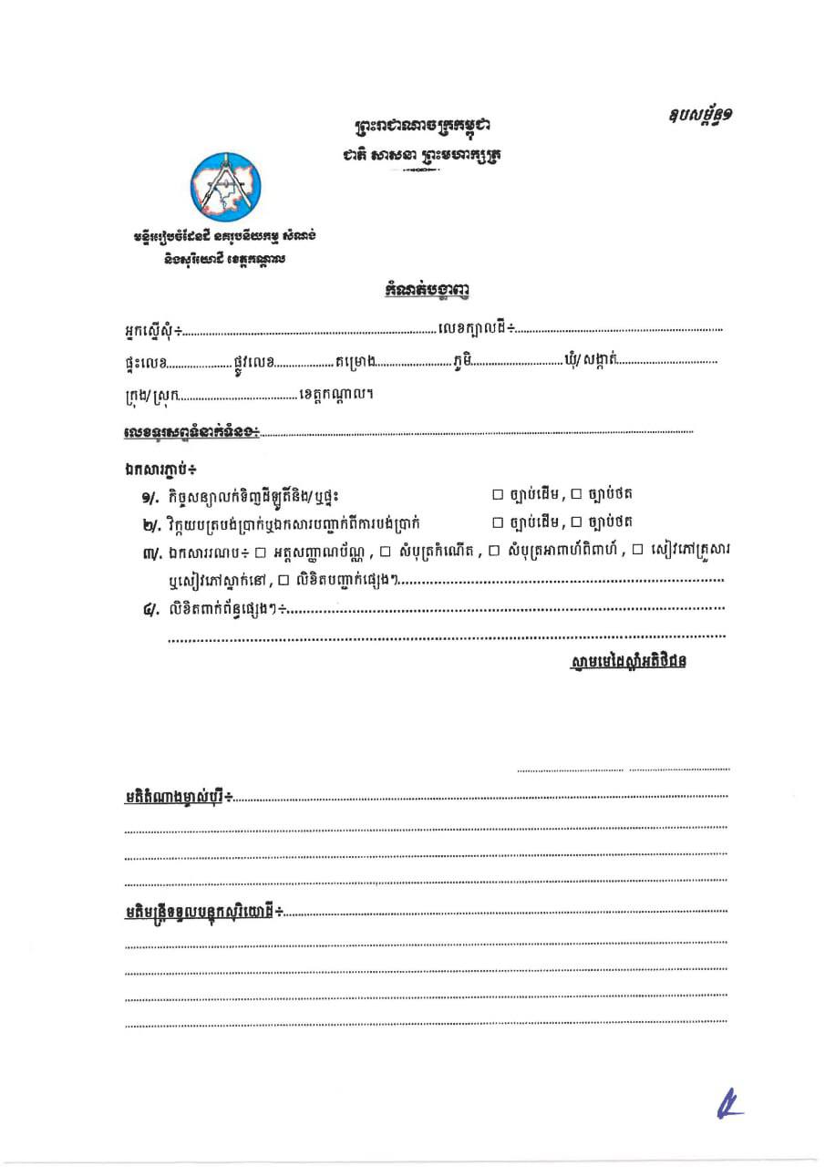 ជាមួយគ្នានេះ អតិថិជន ក៏តម្រូវឲ្យភ្ជាប់មកជាមួយនូវឯកសារដូចជា៖ ១. កិច្ចសន្យាលក់ទិញដីឡូត៍និង/ឬផ្ទះ (ច្បាប់ដើម)។ ២. វិក្កយបត្របង់ប្រាក់ឬឯកសារបញ្ជាក់ពីការបង់ប្រាក់ (ច្បាប់ដើម)។ និង៣. ឯកសារពាក់ព័ន្ធនឹងការស្នើសុំចុះបញ្ជីផ្ទេរកម្មសិទ្ធិ។