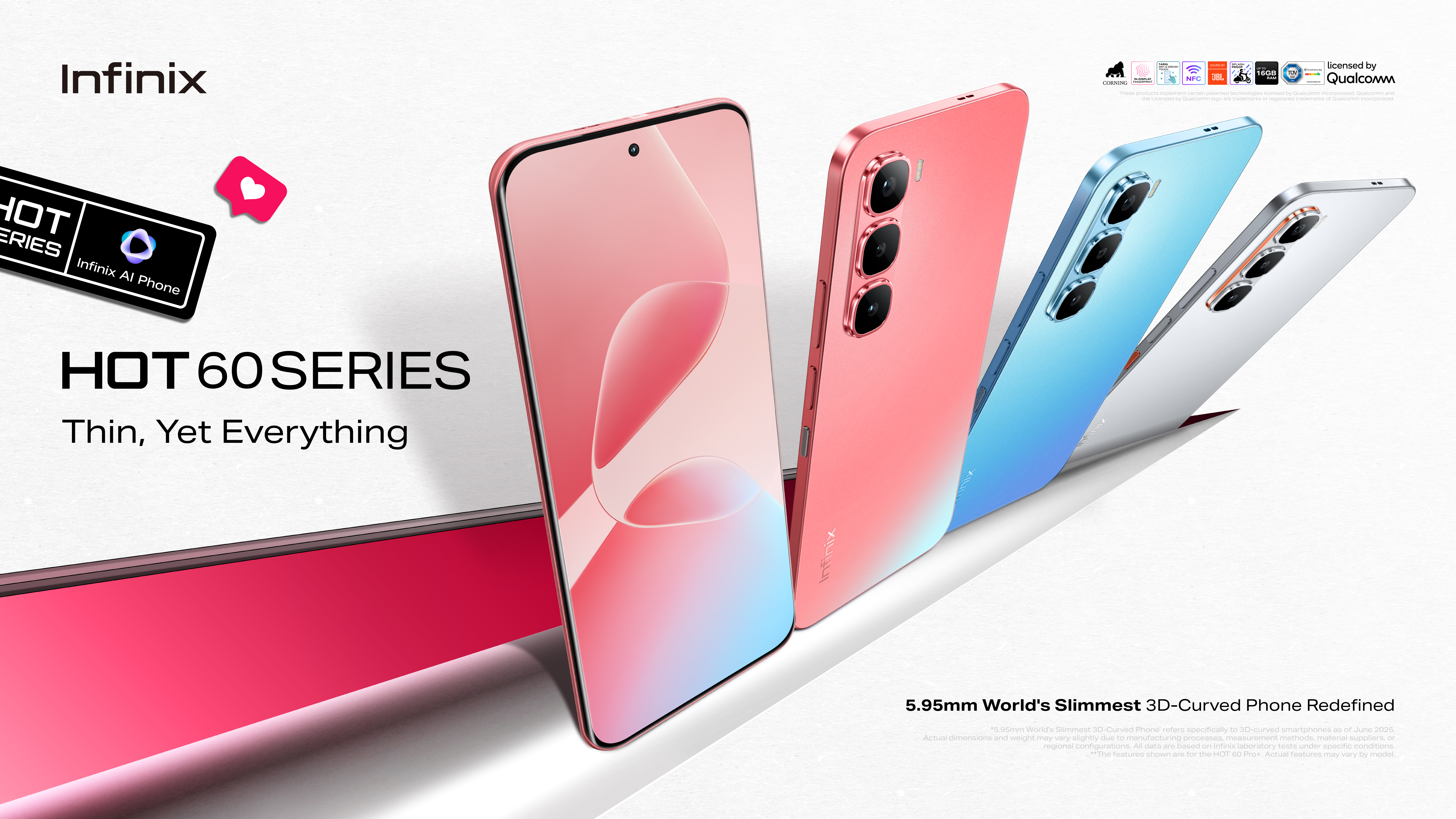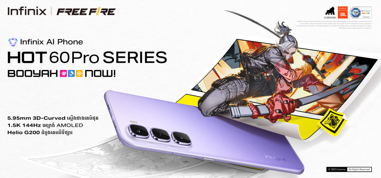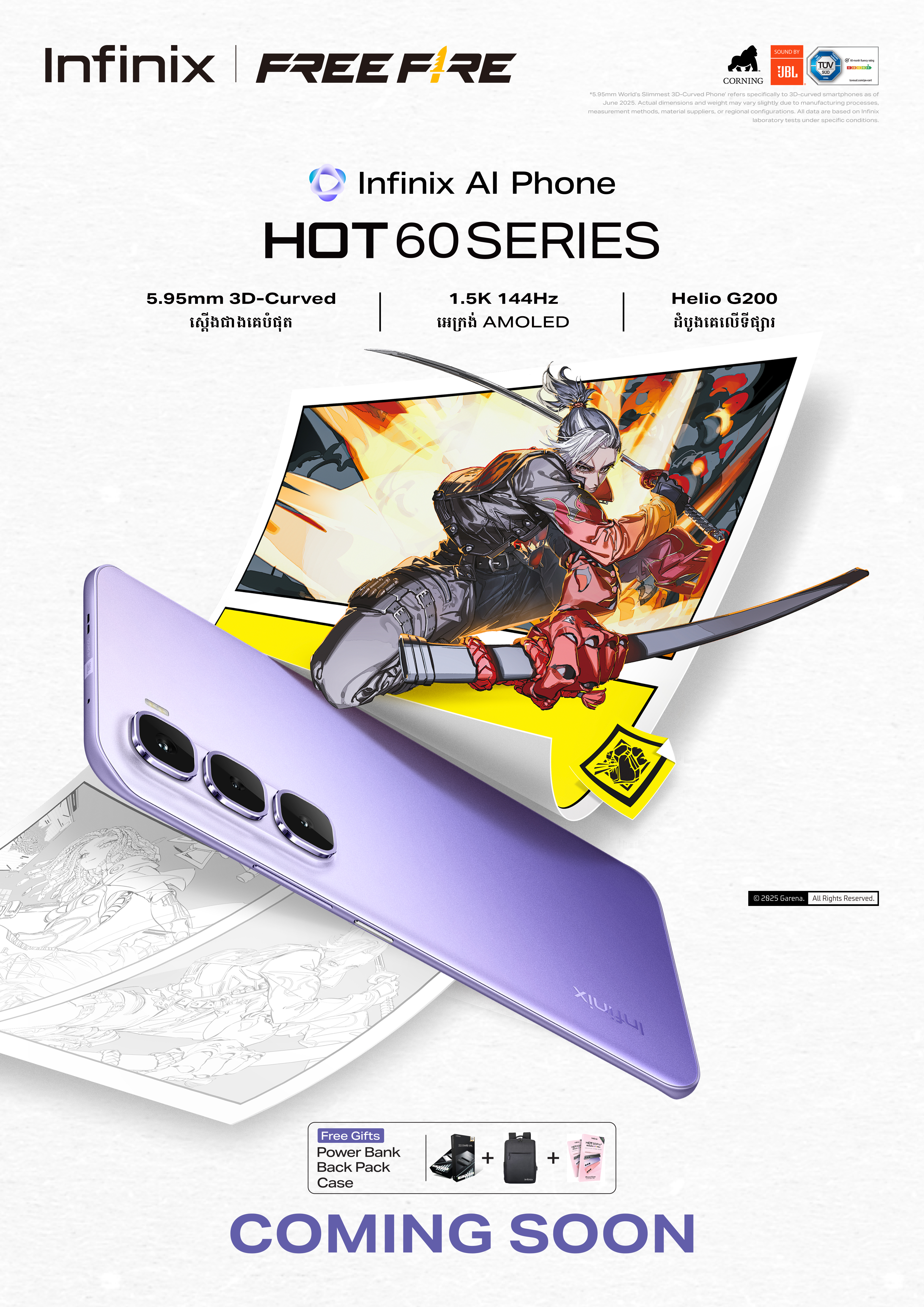 Infinix នឹងចេញលក់ទូរសព្ទអេក្រង់កោង 3D ស្ដើងបំផុត Infinix HOT 60Pro Series នៅក្នុងទីផ្សារកម្ពុជា។ ស្មាតហ្វូន HOT 60Pro Series ក៏ជាការសហការជាមួយហ្គេមដ៏ពេញនិយម FreeFire ផងដែរ។ ក្នុងនោះផងដែរ Infinix HOT 60 Pro+ មានរាងស្តើងត្រឹមតែ 5.95 មីលីម៉ែត្រនៅចំណុចស្តើងបំផុតរបស់វា ហើយត្រូវបានទទួលពានរង្វាន់ Guinness World Record ជាផ្លូវការសម្រាប់ជា ទូរសព្ទកោង 3D ស្ដើងបំផុតរបស់ពិភពលោក នៅថ្ងៃទី 20 ខែសីហា ឆ្នាំ 2025 នៅប្រទេសឥណ្ឌូនេស៊ី។