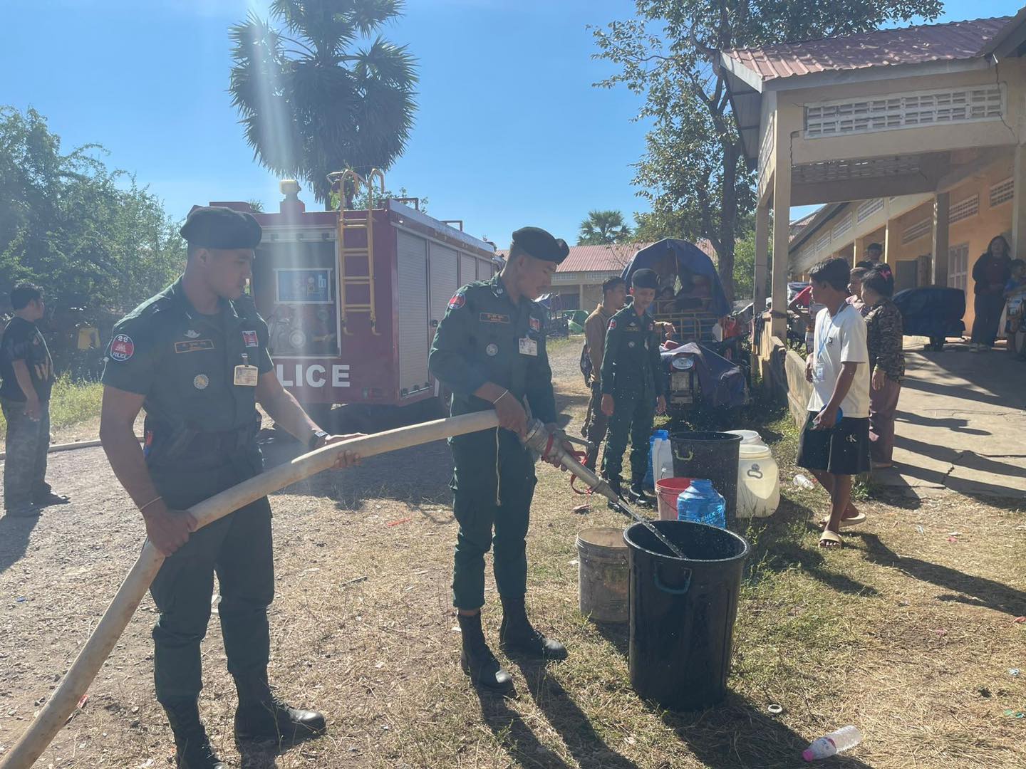 នៅថ្ងៃដដែល លោកឧត្តមសេនីយ៍ត្រី ប៊ុន ផេង ស្នងការរង ផែនការងារគ្រប់គ្រងអាវុធគ្រឿងផ្ទុះ និងអគ្គិភ័យ, លោកលោកវរសេនីយ៍ទោ វឹក វើន នាយការិយាល័យបង្ការ ពន្លត់អគ្គិភ័យ និងសង្គ្រោះ បានដឹកនាំកម្លាំងនគរបាលជាច្រើនរូប បាននាំយករថយន្តដឹកទឹក ចំនួន ២គ្រឿង ចុះចែកទឹកដល់ ជនភៀសសឹកប្រើប្រាស់ ចំនួន ២ស្រុក ក្រុង ១ រួមមាន ក្រុងសិរីសោភ័ណ ស្រុកមង្គលបូរី និងស្រុកភ្នំស្រុក។